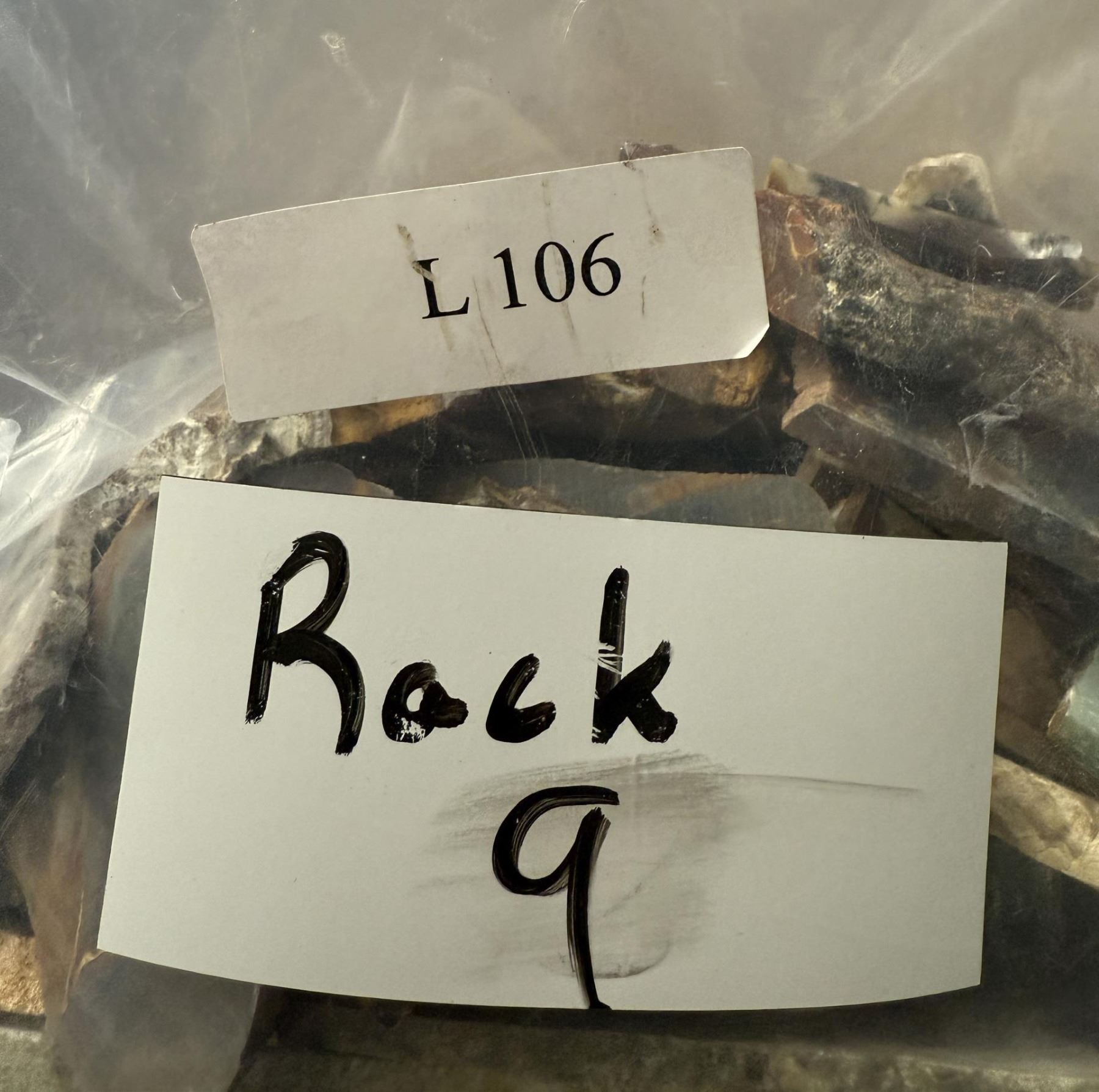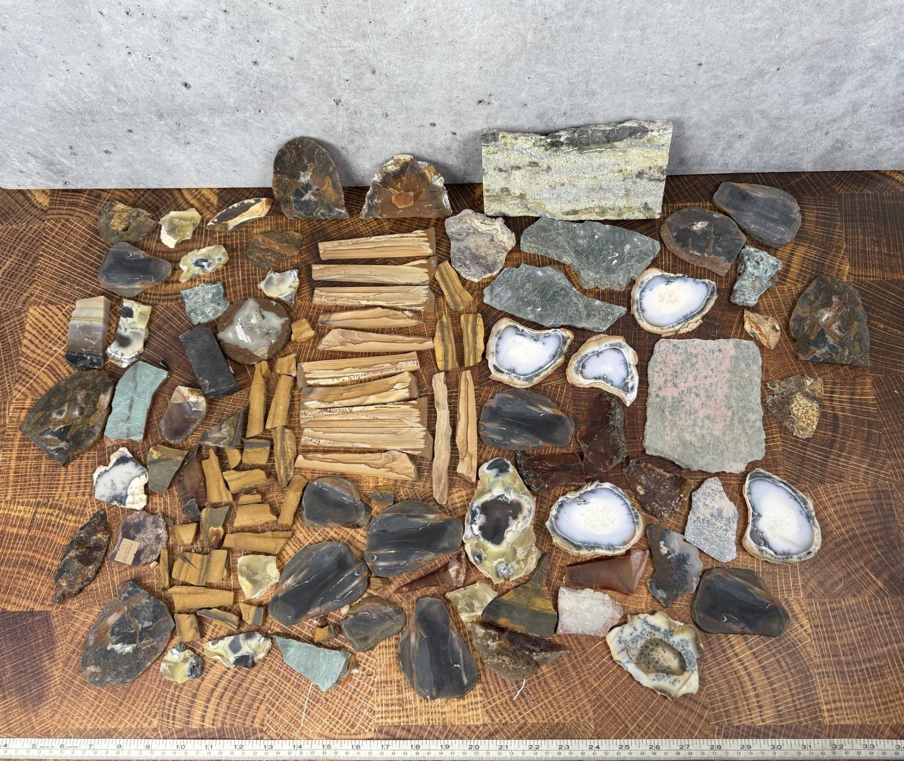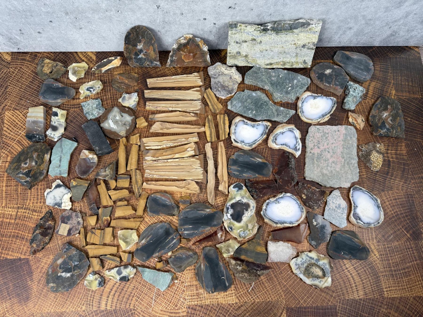 Includes petrified wood, denditric opal, agate, & more. 10.4 lbs total weight. Provenance: From the estate of Moosehead Gallery rock shop in Hamilton, Montana.