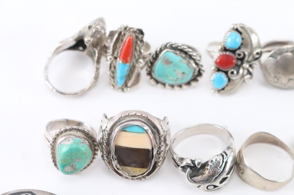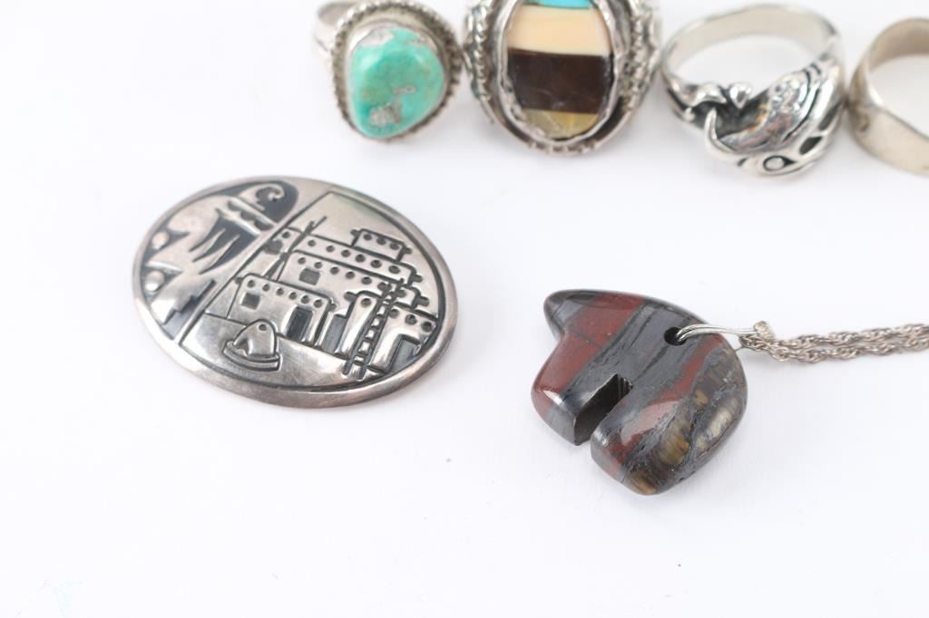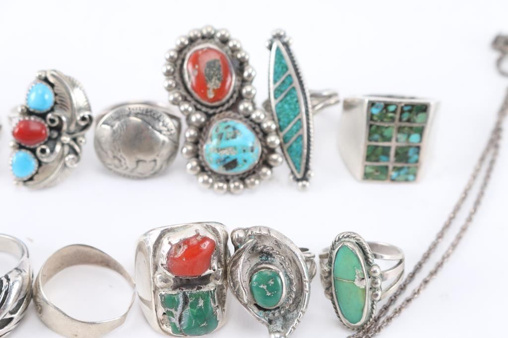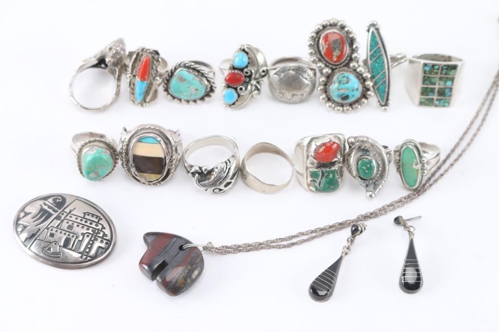3 Men and 11 Womens' all sterling silver rings, one pair jet earrings and stone bear fetish pendant, one Hopi adobe pendant, all sterling silver.