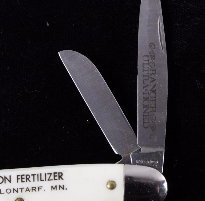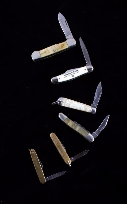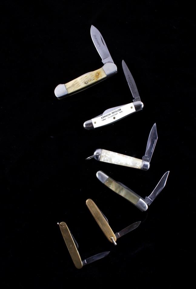 This lot features a collection of six pocket knives. First up, in this lot is a Schatt & Morgan two blade pen knife. Next is a Ranger advertising jack knife. Third is a Manzoor two blade canoe pocket knife. Fourth is a Imperial jack knife. Fifth is a Cattaraugus Little Valley two blade knife. Finally we have a Colonial Pen two blade knife. The overall condition of the collection is good for its age. Measures: 1" Blade Length, 2" Blade Length, 2" Blade Length, 2 3/8" Blade Length, 2" Blade Length, 1" Blade Length
