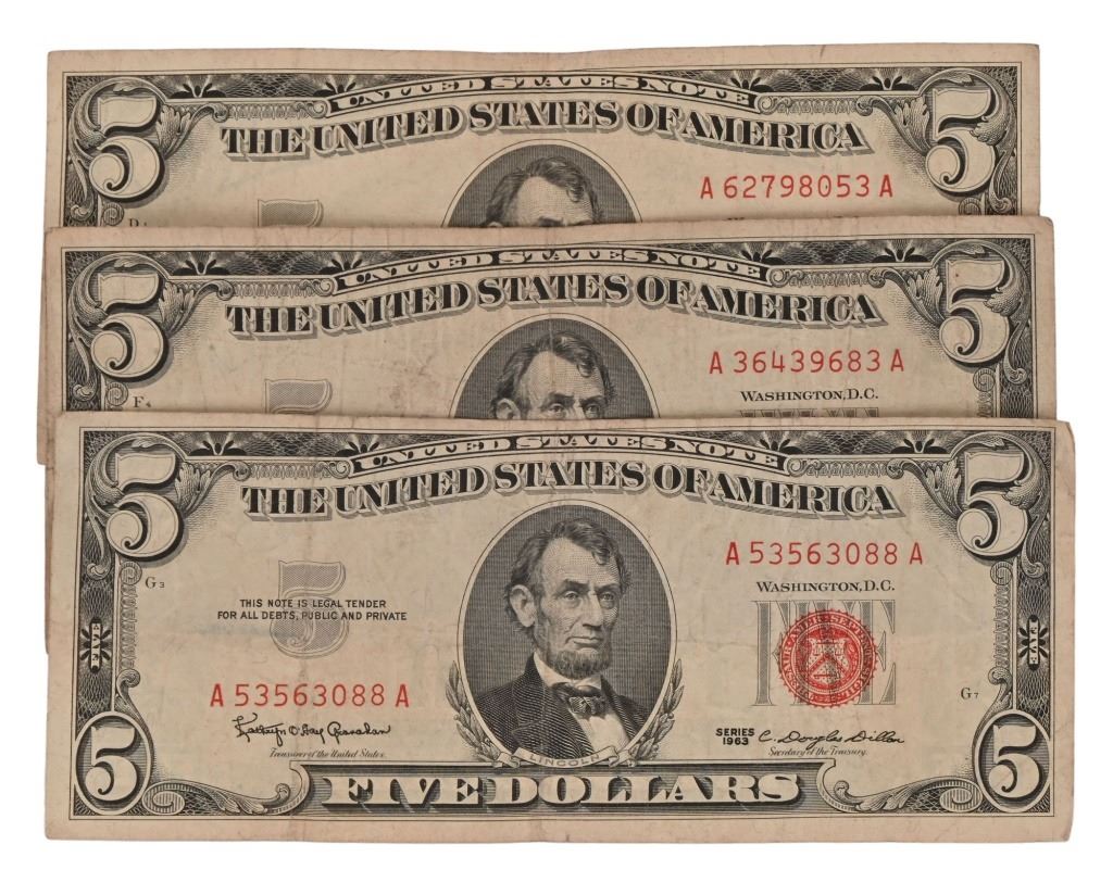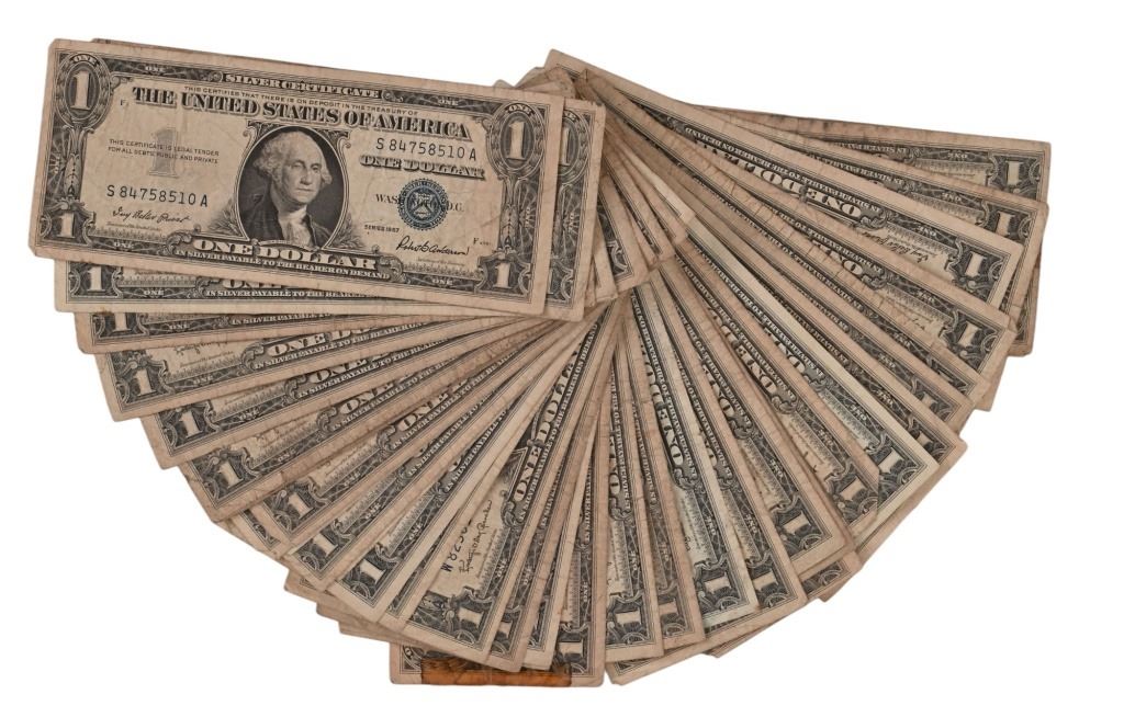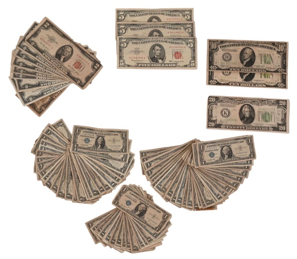 This Lot has (29) 1935 Series and (82) 1957 Series Silver Certificates. Also (1) 1928 Series, (7) 1953 Series, (2) 1963 Series Two Dollar Red Seal Notes, (4) 1963 Series Five Dollar Notes, (2) 1934 Series Ten Dollar Notes and (1) 1934 Series Twenty Dollar Note.