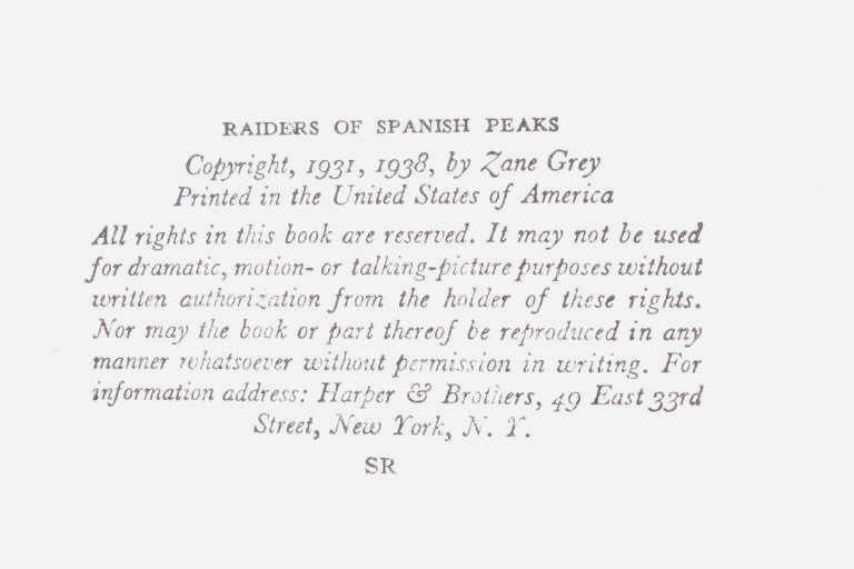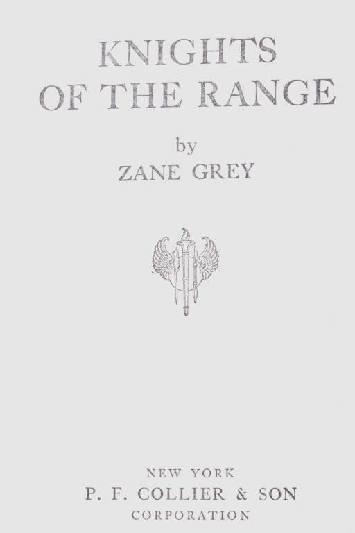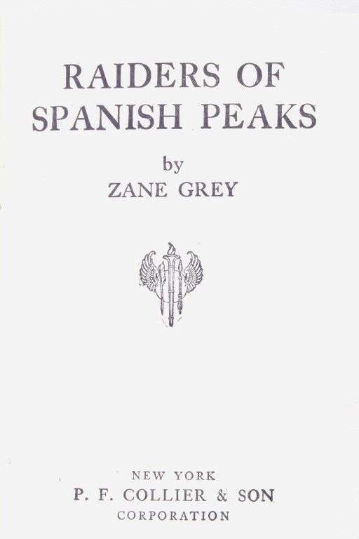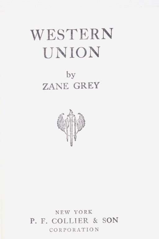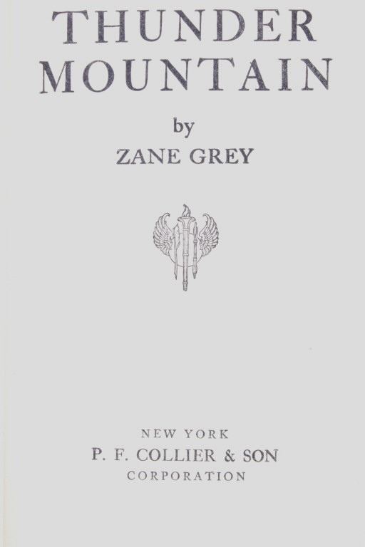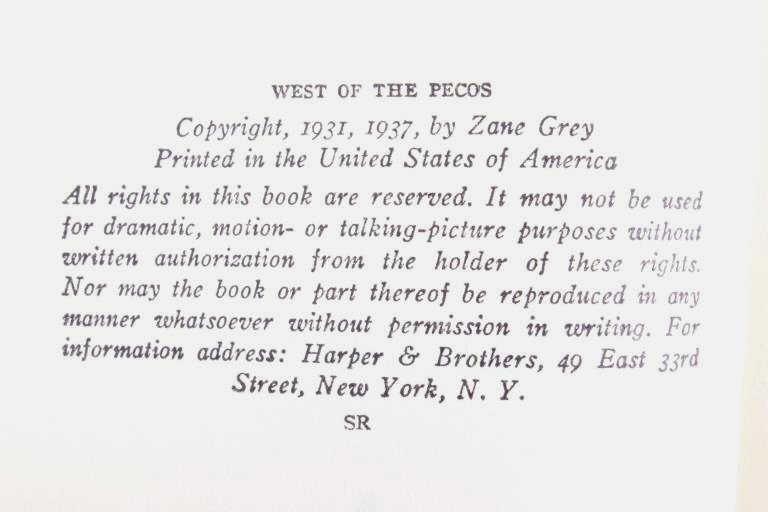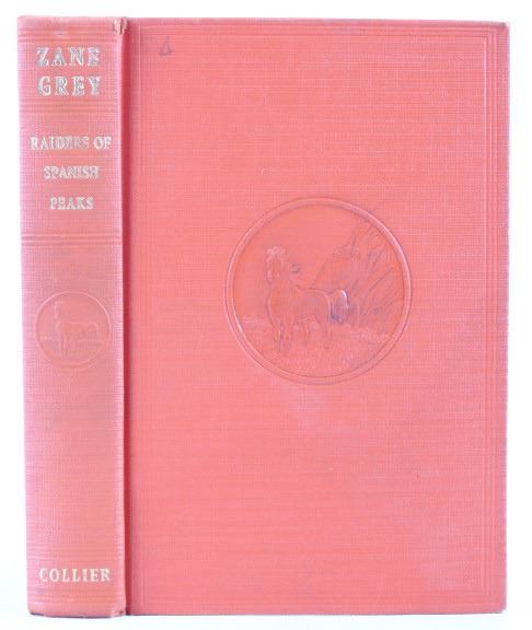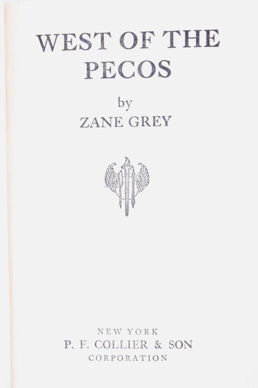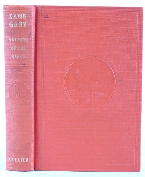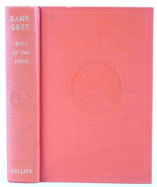 For your consideration is this collection of six different early edition Zane Grey Western novels, published by P.F. Collier & Son Corp. The titles are as follows: West of the Pecos, Raiders of Spanish Peaks, Knights of the Range, Western Union, Thunder Mountain, and The Lost Wagon Train. All books are in very good condition with good bindings. Some have previous owners' markings. All are bound in orange cloth, with stamped cover and spine and gilt titles on the spine. Each measures about 5.25" x 7.5".