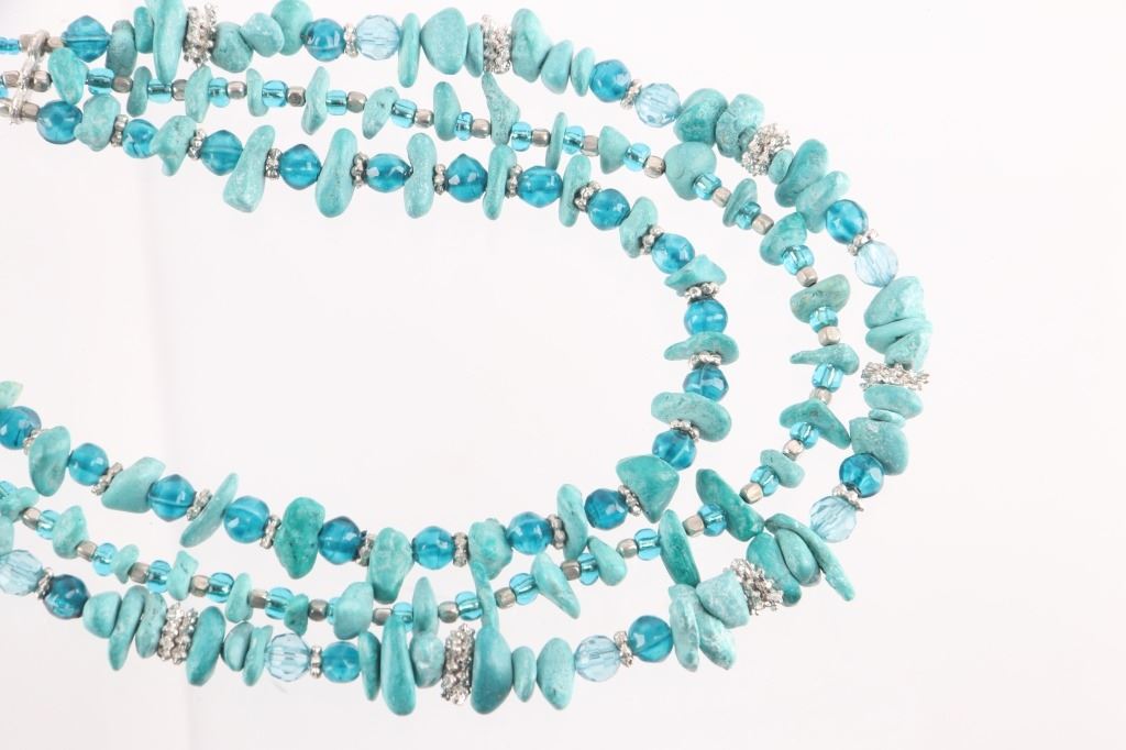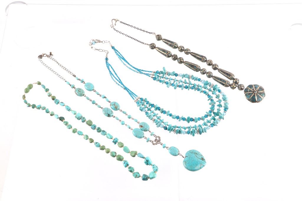 This lot is a collection of four necklaces. The first necklace has a heart shaped, 11/2", turquoise colored stone on the bottom hanging from a 19" necklace of multiple stones. The next necklace is made of blue and green small, turquoise-colored nuggets strung on nylon with knots between each stone. This necklace is 20" long. The third necklace is made of turquoise colored glass seed beads, trade beads, silver flat spacers, and turquoise-colored nuggets. The necklace is made of three strands of various length; the shortest strand is 22". The last necklace is 20" long with a 1 3/8" round flower shaped pendant with 8 "petals". The beads are round and cone shaped with a unique middle eastern style. All of these necklaces are in good, used condition.