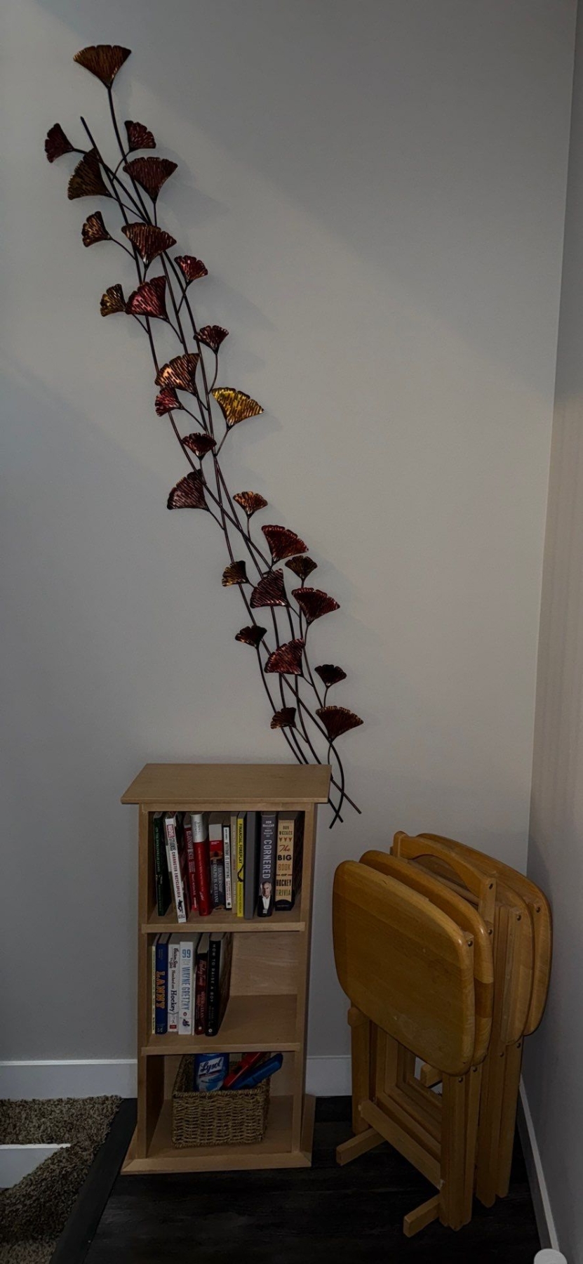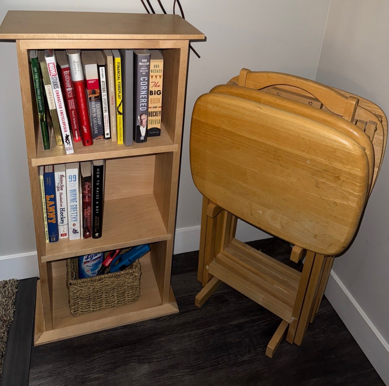Collection Of Various Home Decor- Wall Art, TV Tables(4), Small Book Shelf ++ Books