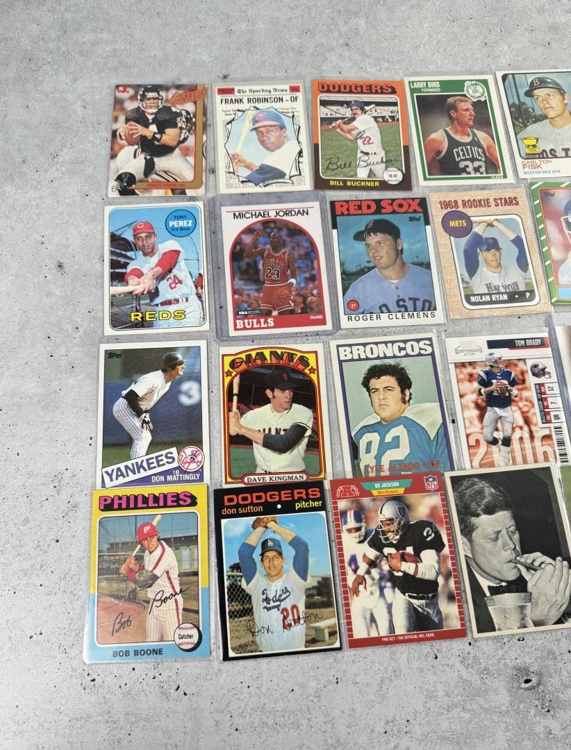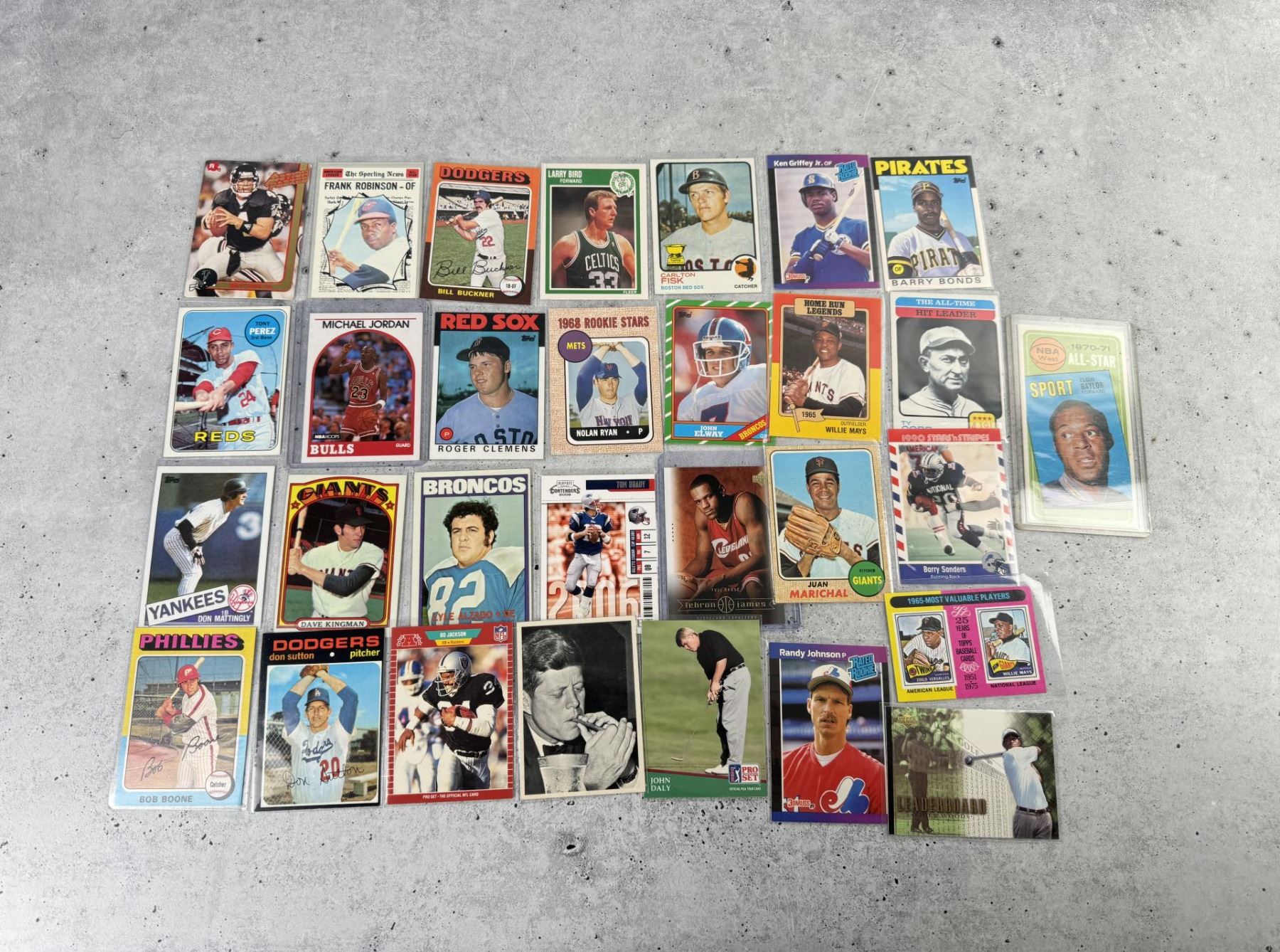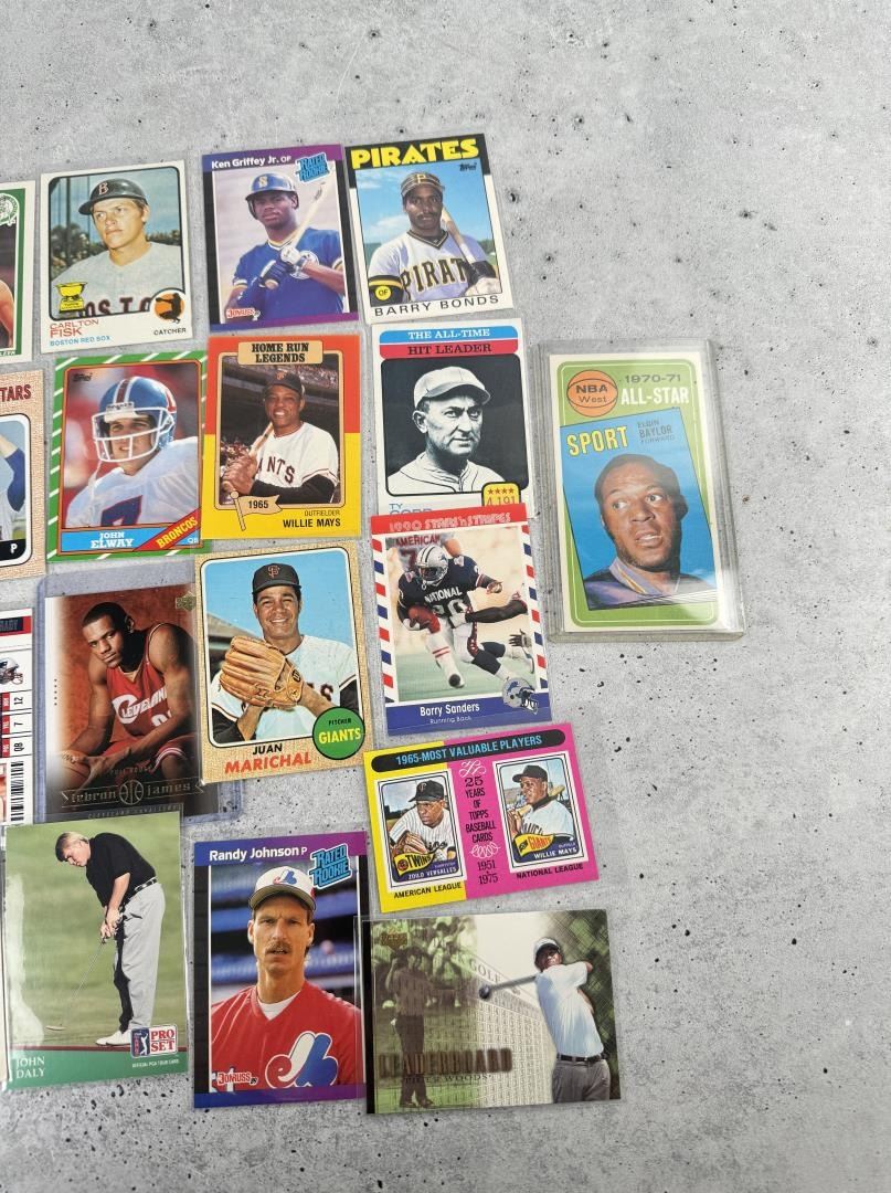 Nice grouping. 1991 Action Packed Brett Favre, 1970 Frank Robinson, 1975 Bill Buckner, 1989 Larry Bird, 1973 Carlton Fisk, 1989 Ken Griffey Jr Rookie, 1986 Barry Bonds, 1969 Tony Perez, 1989 Michael Jordan, 1986 Roger Clemens, Nolan Ryan, 1986 John Elway, Willie Mays, 1973 Ty Cobb, 1970 Elgin Baylor, 1985 Don Mattingly, 1972 Dave Kingman Rookie, 1972 Lyle Alzado, Tom Brady, 2003 Lebron James, 1968 Juan Marichal, 1990 Barry Sanders, 1965 Mays Versalles, 1975 Bob Boone, 1971 Don Sutton, 1989 Bo Jackson, 1964 John F. Kennedy, 1991 John Daly, 1989 Randy Johnson Rookie, 2000 Tiger Woods.