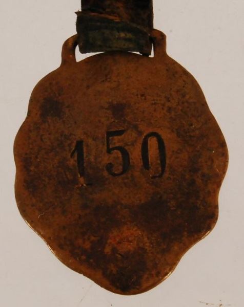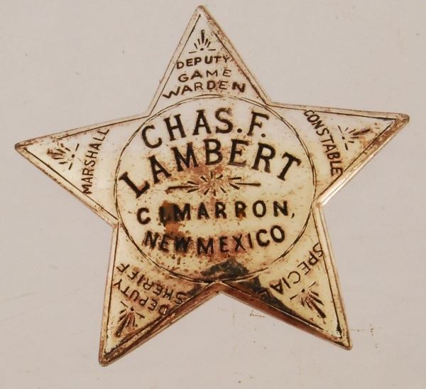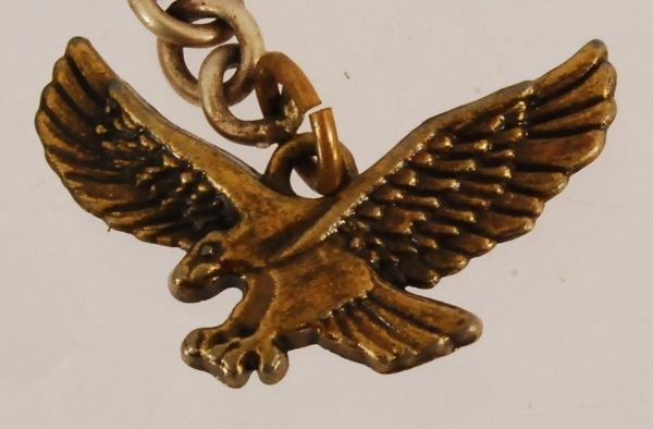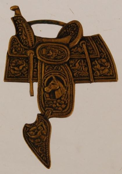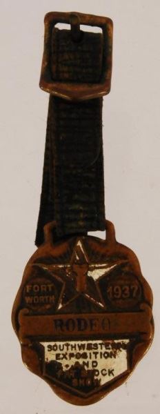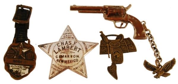 2 watch fobs, a 1937 Fort Worth Rodeo and a saddle. Chas. F. Lambert toy badge. Miniature pistol with chain and eagle.
