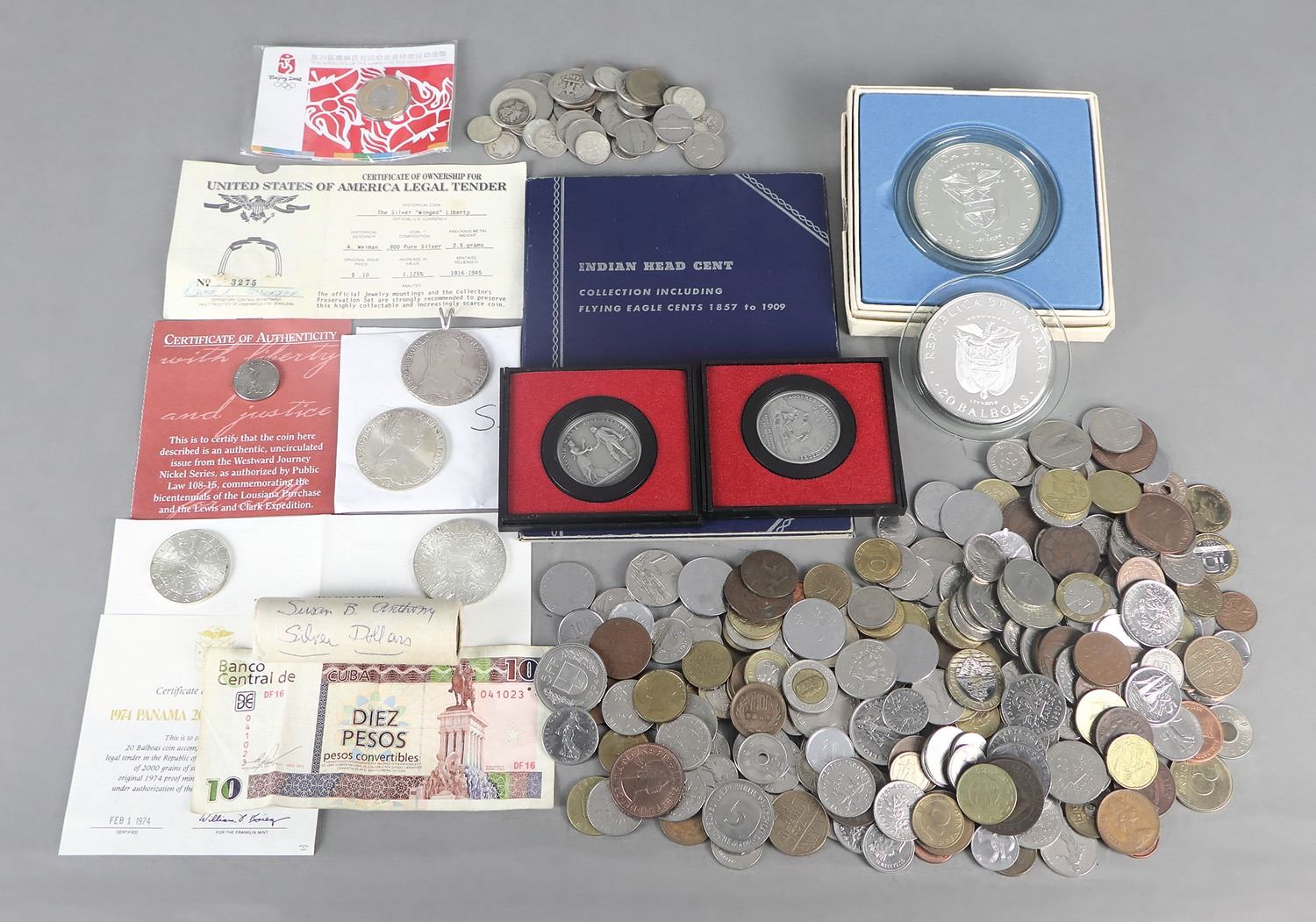 highlights include: (2) 1974 .925 Sterling Silver 20 Balboas 4.16 oz. Proof Coins, some U.S change with some silver coins throughout; a bag full of misecellaneous foreign coins with some potential surprises (3) Silver Thalers; plus more; please inspect (100+ coins). Shipping charges apply - weight 6.6 lbs.