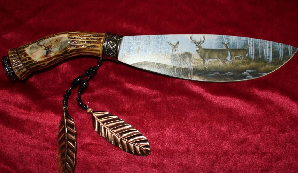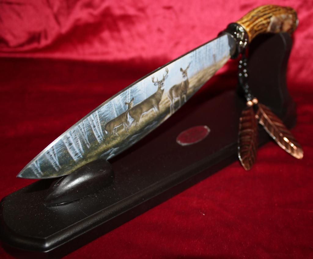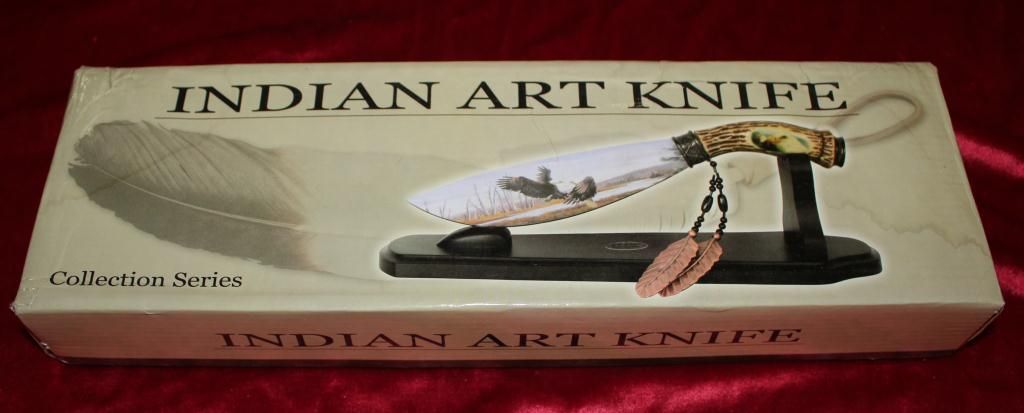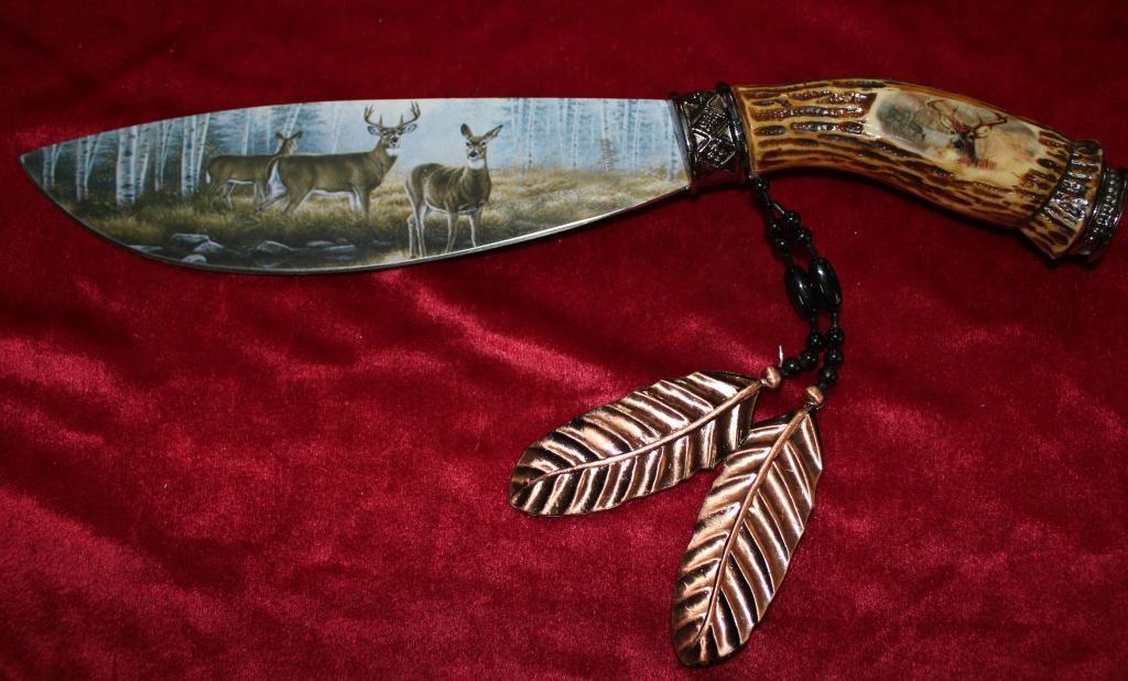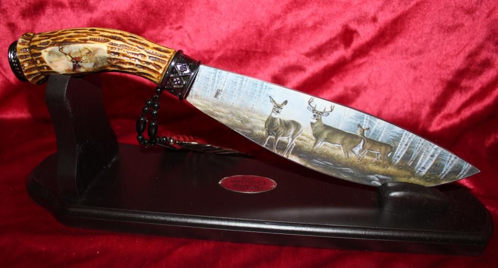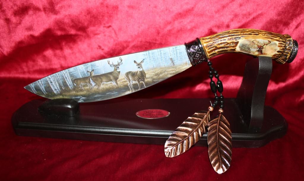 '06 Wildlife Series. 12.5" Bowie Knife W/ 7.5" Blade. Flying Eagle On Blade W/ Eagle Head On Handle - Both Sides. Molded Imitation Stag Handle W/ Metal Bolster & Pommel