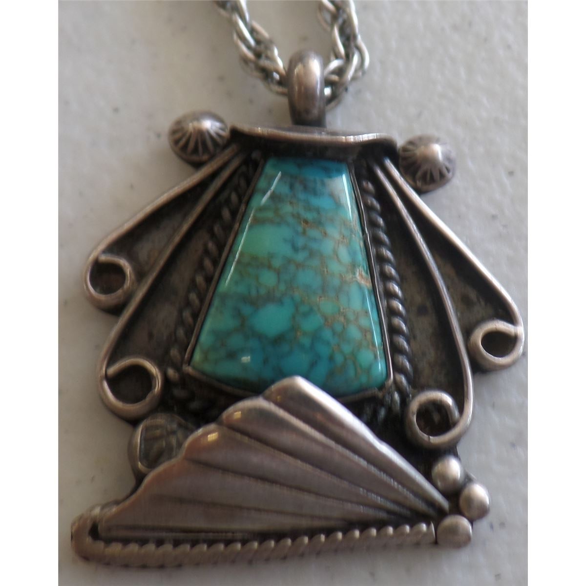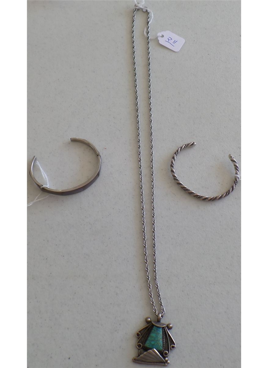 Sterling Silver Necklace and Sterling Silver Turquoise pendant, one sterling bracelet and on SS bracelet with possibly mother of pear or amethyst inlay. The necklace is 12" long, the pendant is 1.25 x 1.25 x .25 inches, the Bracelets are approximately 2.5 x 2 inches. Total weight is approximately 39 grams. Great condition see images. Shipping: $15.00