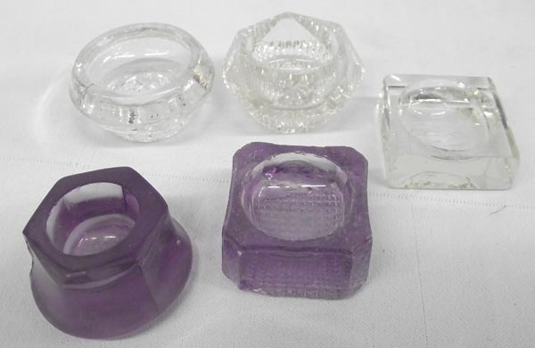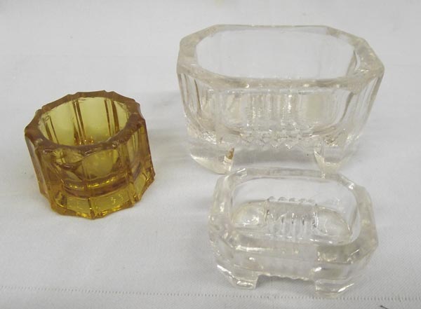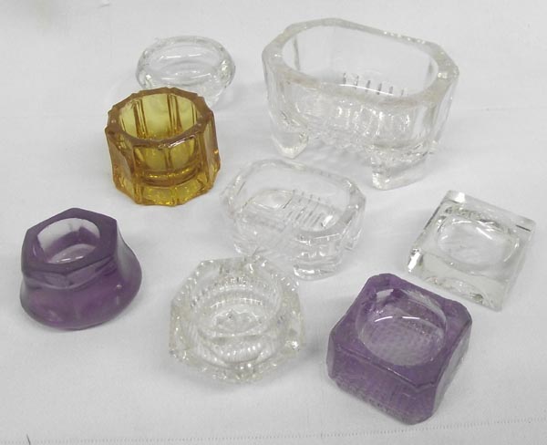 Collection Vintage Salt Cellars. 1 large master salt, 2 purple, 1 amber & 5 clear. Pressed and cut, some chips. Largest measures approx. 1 3/4''H x 3''L x 2 1/4''W. Buyers Pay Actual Shipping and Handling Charges(see terms and conditions for more information).