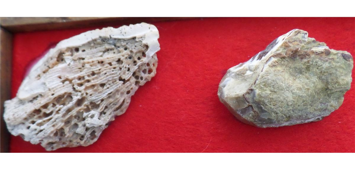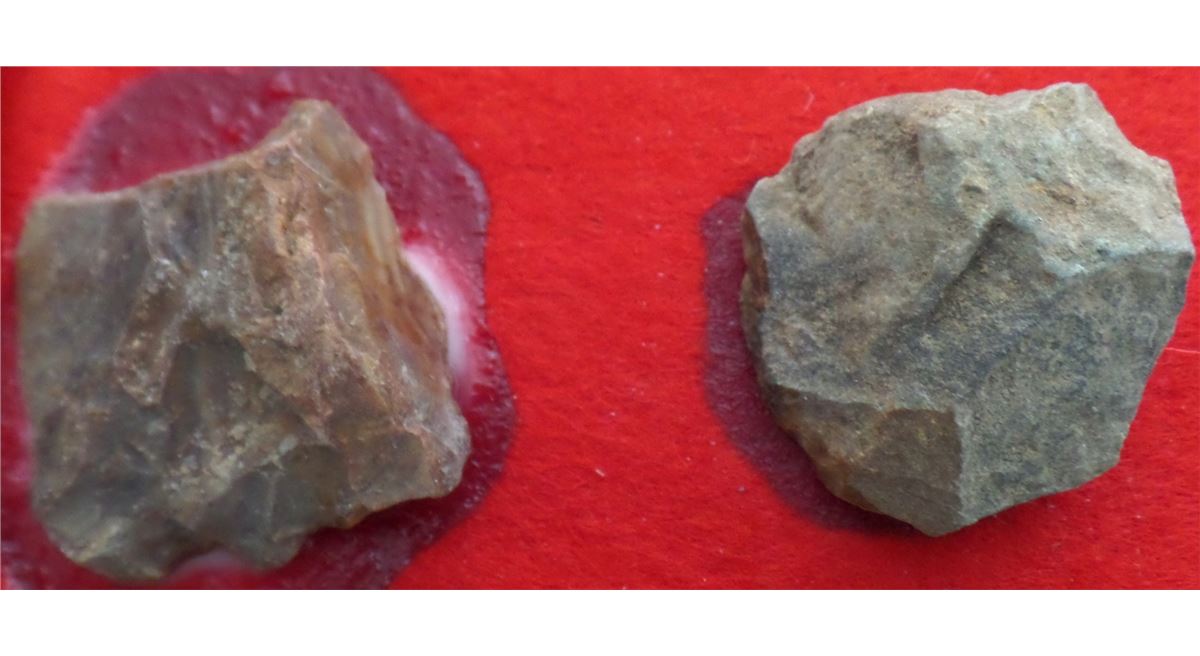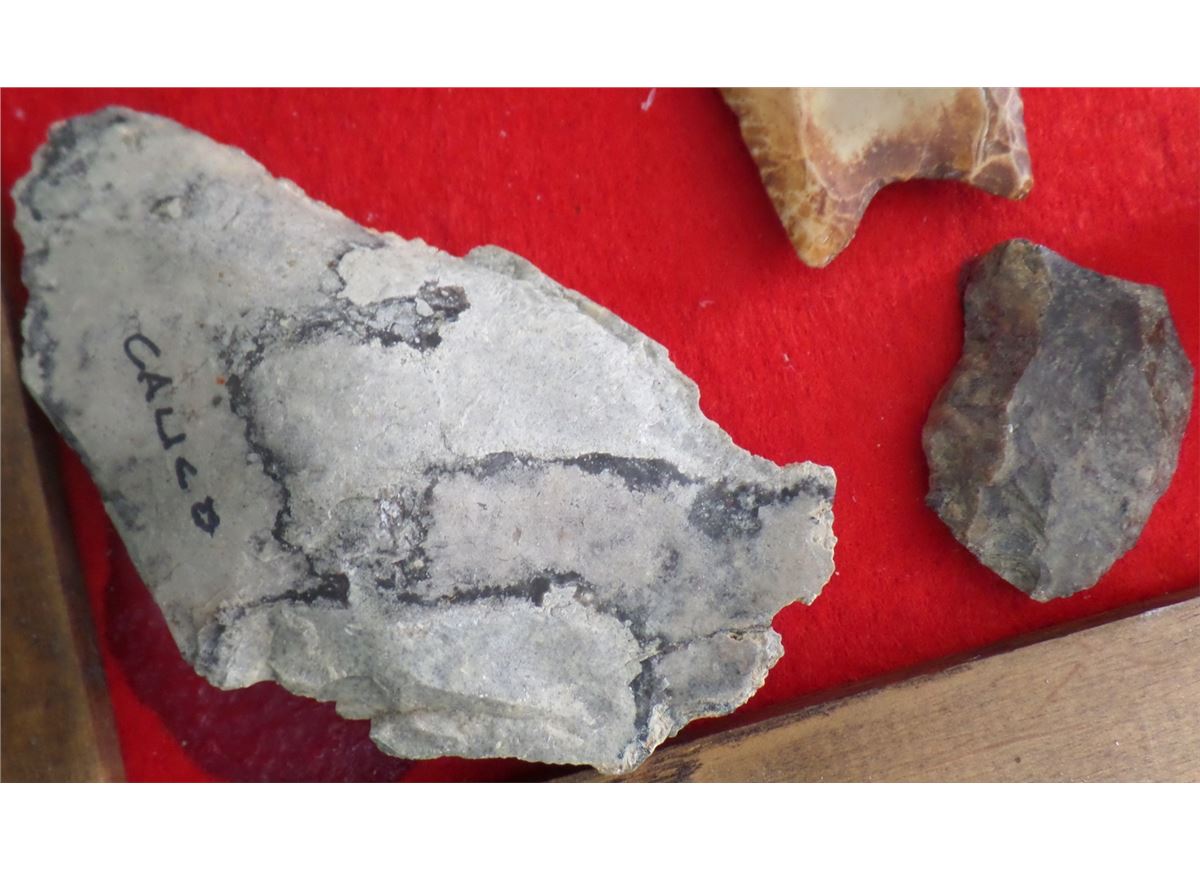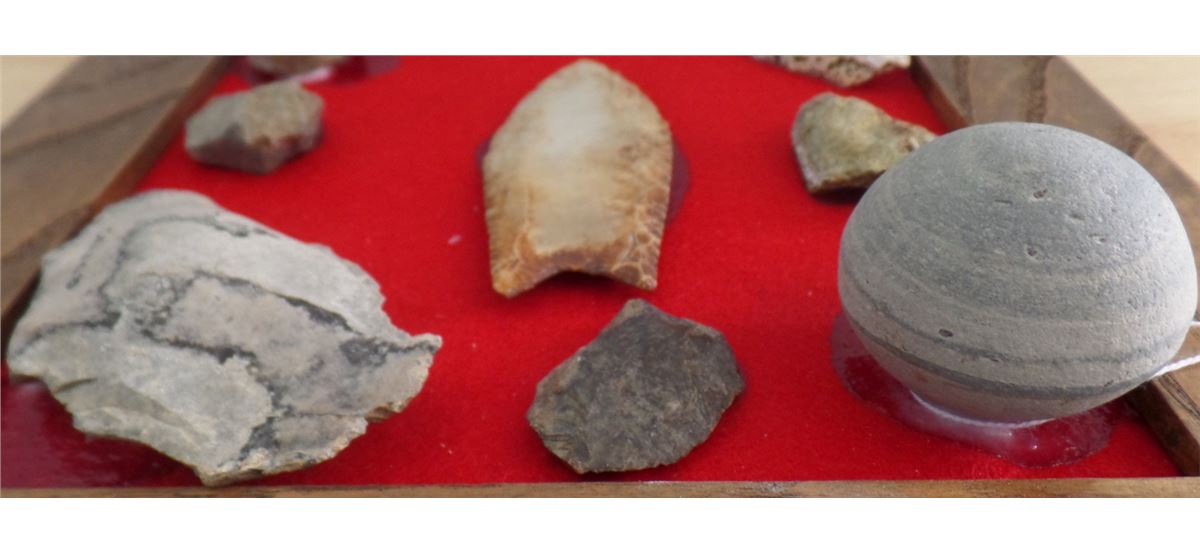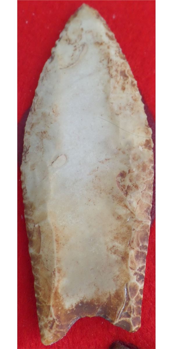 Collection from Calico California consisting of Clovis point 4 1/2 x 1 3/4 inches. The other Palo items are from 1 1/2 to 3 1/2 inches. The Clovis has full flute on each side. Items in collection are shell, sandstone and chert. Game stone and Clovis are in good condition. Other items damaged. Shipping $30.00