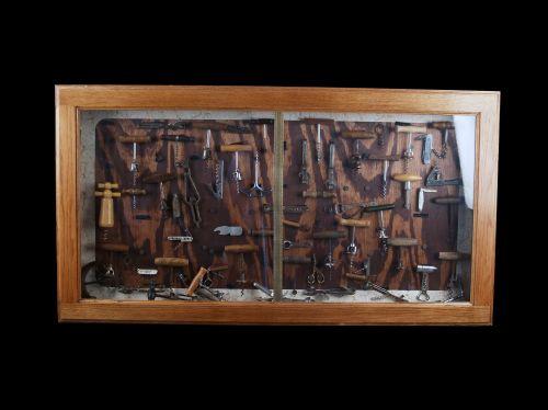 Collection in a Showcase "Rare, Advertising Corkscrews" 1870's to 1950's in a beautiful case to hang on a wall Many have advertising on them