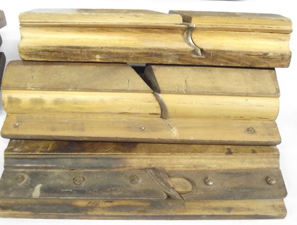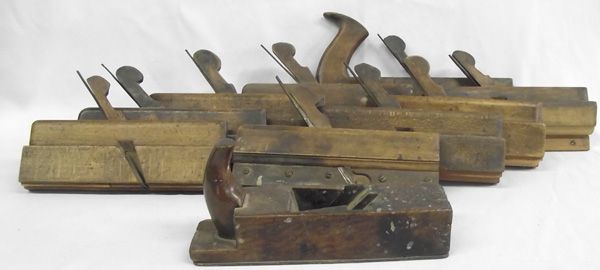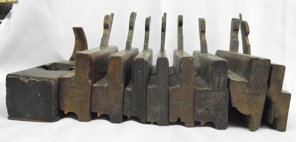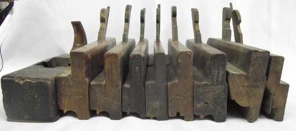 Collection of 10 Antique Wooden Planes. Useful and handsome set of molding planes and one surface plane. the large molding plane with a handle measures 12''L x 7''H.