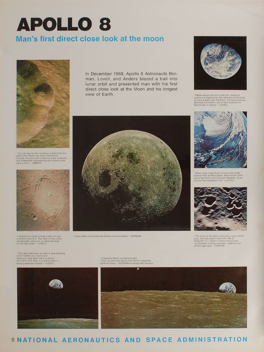 Complete set of ten official 30 x 40 NASA educational posters about the Apollo program, with one poster featuring the famous Apollo 8 ‘Earthrise,’ another specific to Apollo 8, and other subjects including “Command/Service Modules,” “Lunar Modules,” “Astronaut Training,” “Complex 39 Vehicle Assembly Building,” “Saturn V,” “Flight to the Moon,” “Return Flight to Earth,” and “Workshop in Space.” In very good to fine condition. Accompanied by the original mailing tube.