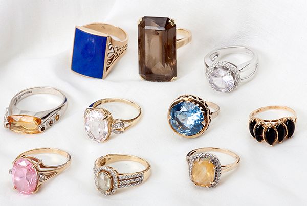 Collection of 10 Gemstone, Gold Lady's Rings. Including one smokey quartz 14k yellow gold ring; one citrine 14k white gold ring; one lapis 14k yellow gold ring, one onyx 14k yellow gold ring; one blue zircon 14k yellow gold ring; one pink 10k yellow gold ring; one citrine, diamond, 14k yellow gold ring; one kunzite, diamond, 14k yellow gold ring; one clear stone, diamond, 14k white gold ring and one quartz, diamond, 18k yellow gold ring, all having a gross weight of 52.00 grams.