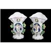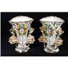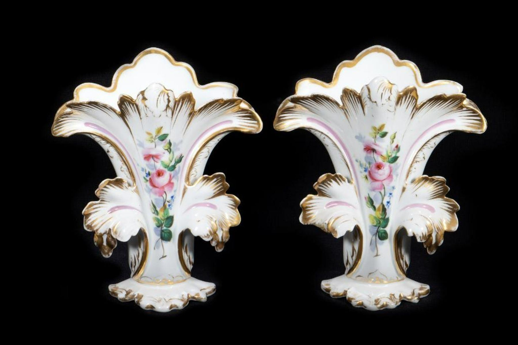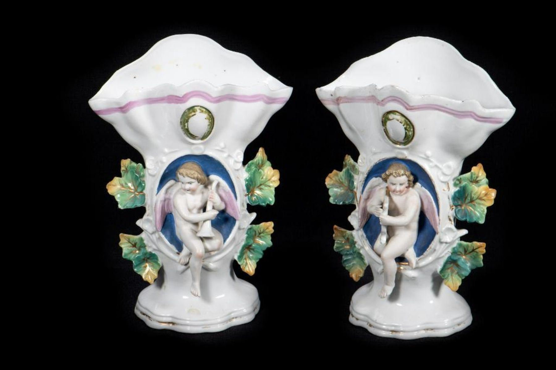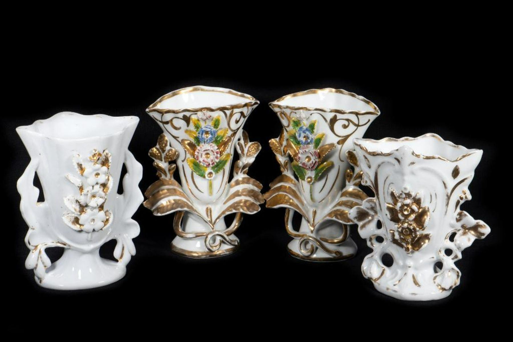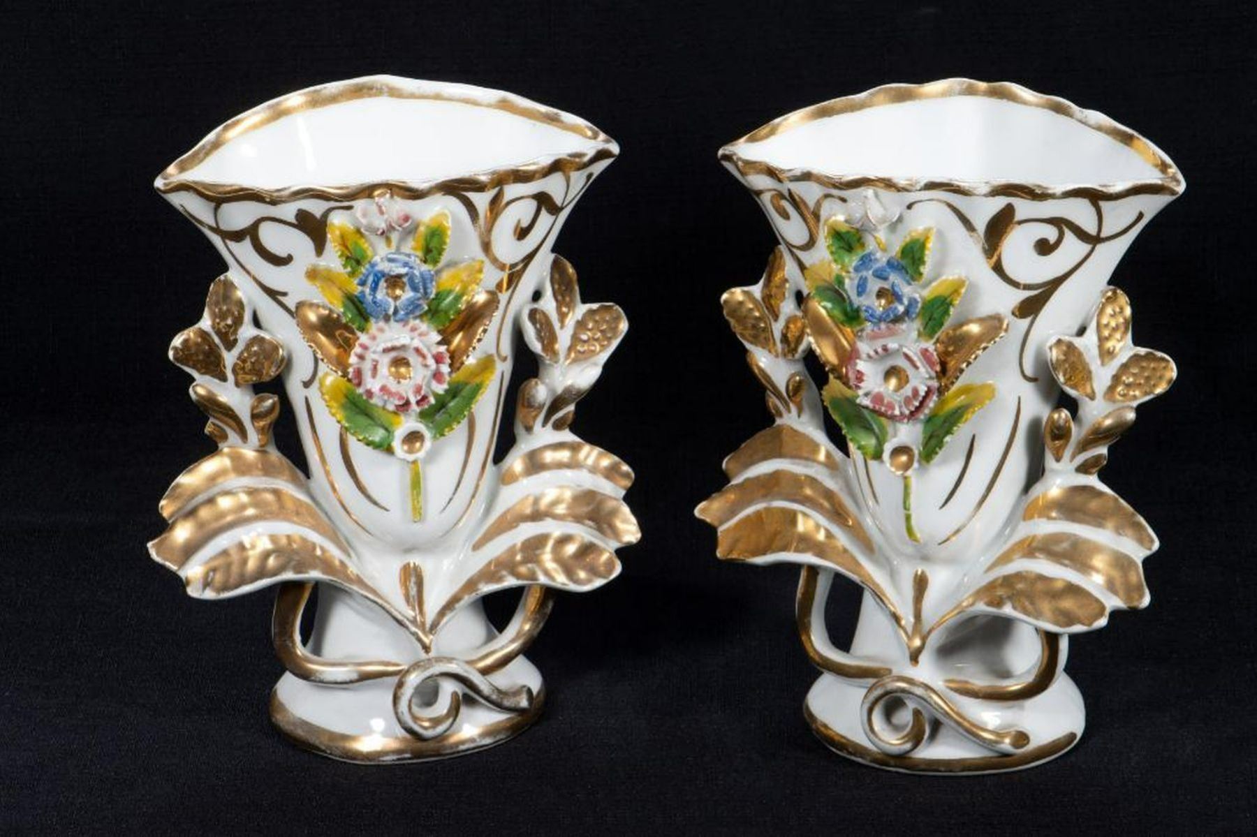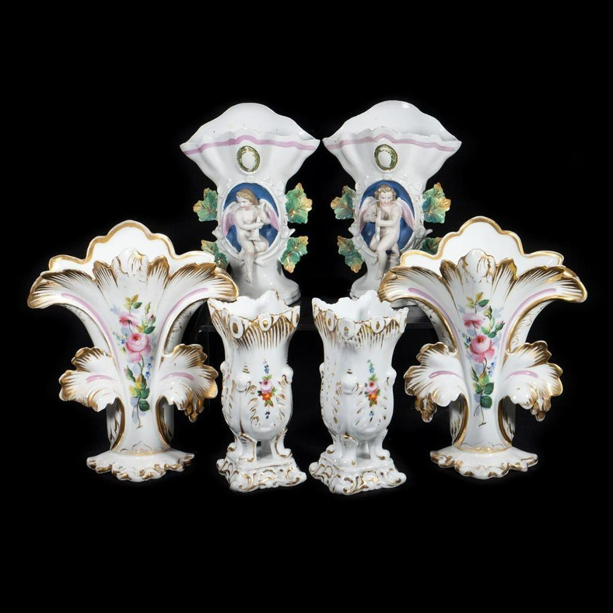 Comprised of three flared-form pairs, one shell-shaped cherub pair, and one cylindrical/four-sided pair. Most are unmarked or with a number only; one with a hand-painted "SM'; one impressed with two facing Ls (one upside down) and "200". The tallest is 8 3/4in., Condition: wear to gilt and color, some small edge chipping on one cherub vase, one of the largest vases with a leaf broken off.