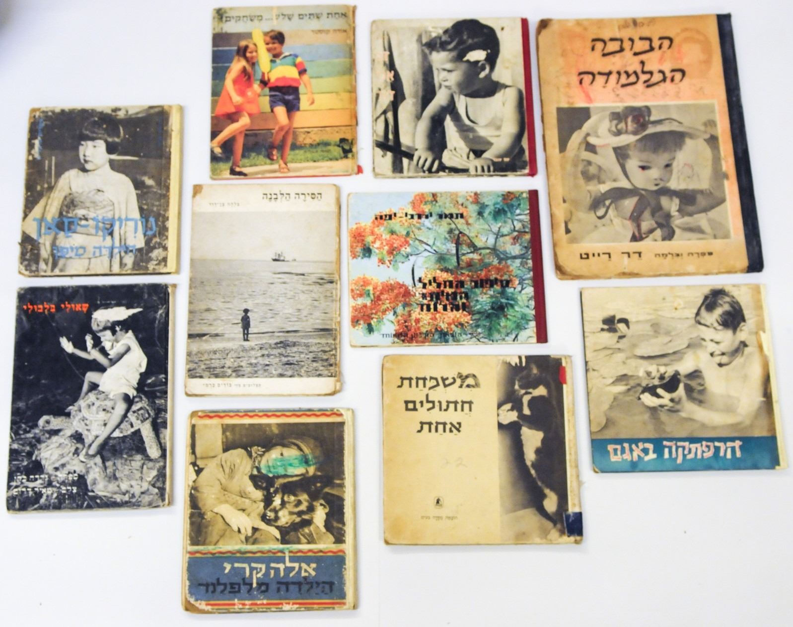 Collection of 10 Israeli children's books with photos: 1. Adventure in the Lake: A Tale from the Sea of Hula, written by H. Razi, photos by Peter Marom, Hakibbutz Hameuchad Publishing House, 1966, in good condition: slightly yellowing, 2. Noriko-san: The Girl from Japan, translated by Lea Goldberg, photos by Hanna Rivkin-Brik, HaKibbutz Ha'Artzi Publishing House, worm holes, 3. Shauli Bilbuli, by Gerda Cohen, photos by Meir Darom, 1972, in good condition: binding slightly worn 4. One, Two, Three ... Play Time, by Ora Koster, photos by Menucha Brafman, gift by Dan Chaschan, 1978, in reasonable-good condition: spine is loose, interior is in very good condition: slightly yellow, 5. Ella Kerri: The Girl from Lapland, translatedby Lea Goldberg, photos by Hanna Rivkin-Brick, published by Kibbutz Artzi, binding loose, some yellowing, 6. It's Me, Dor, by Hannah Verba, Am Oved, in good condition: worn binding, some foxing on first pages, torn edges on second page, 7. One Cat Family, written by Hana Verba, photos by Halev Rachmilevitz-Strenger, Massada Publishers, 1953, in reasonable condition: binding worn, interior: worn, wrinkled and yellow, 8. The White Boat by Bella Ben David, photos by Boris Carmi, Goldberg Press Jerusalem, 1954, in reasonable condition: damaged spine and damage to cover margins, foxing on first and last pages 9. Story of the Flute, the String, and the Spirit, by Tamar Yardeni-Yaffe, Hakibbutz Hameuchad Publishing House, in reasonable condition: binding has been reattached to pages. 10. The Lonely Doll, written and photographed by Dr. Wright, published by Machbarot Lesifrut and Wissotzky House, Culture Fund, 1966, in reasonable-good condition: wear and foxing to binding.