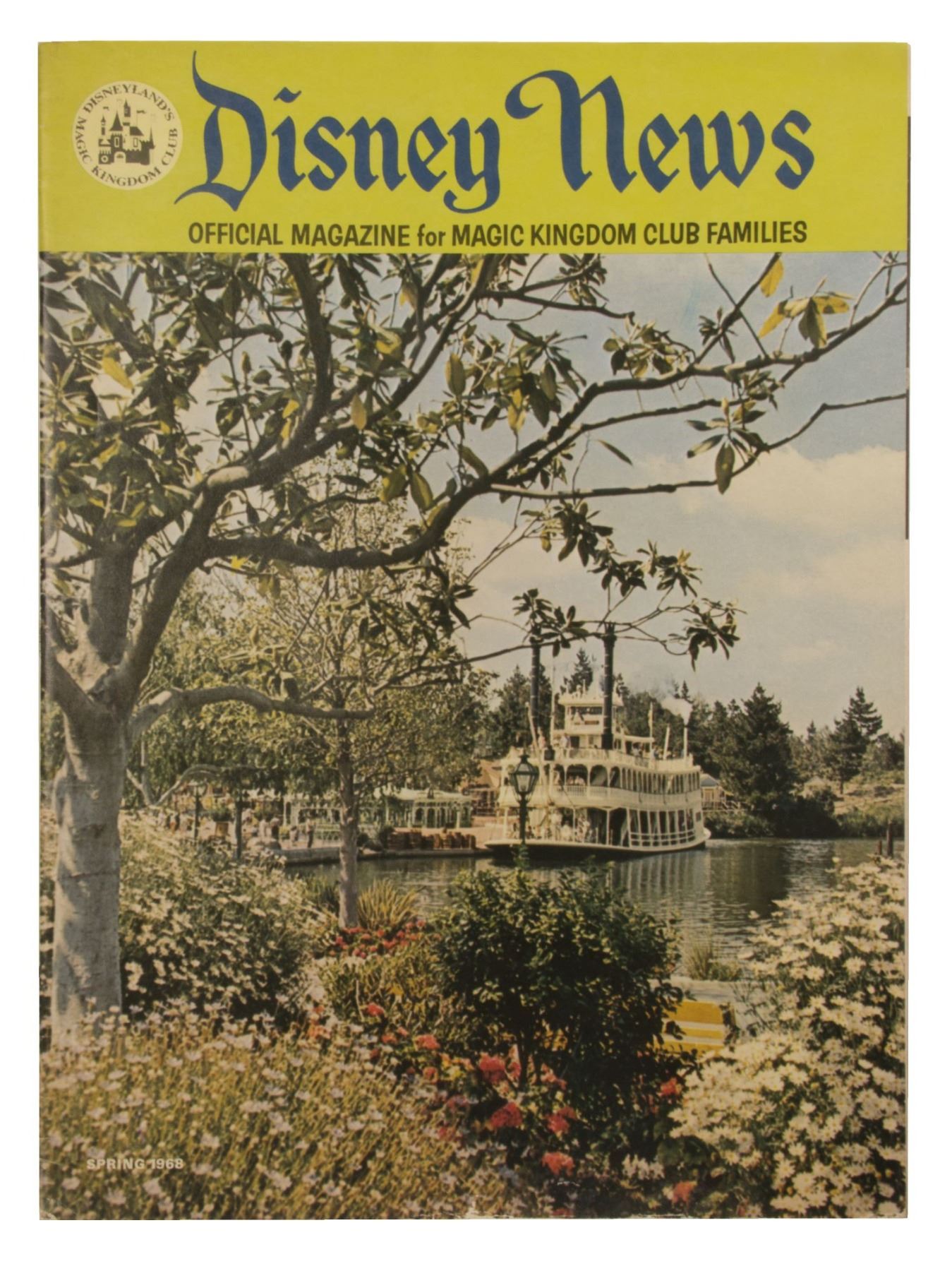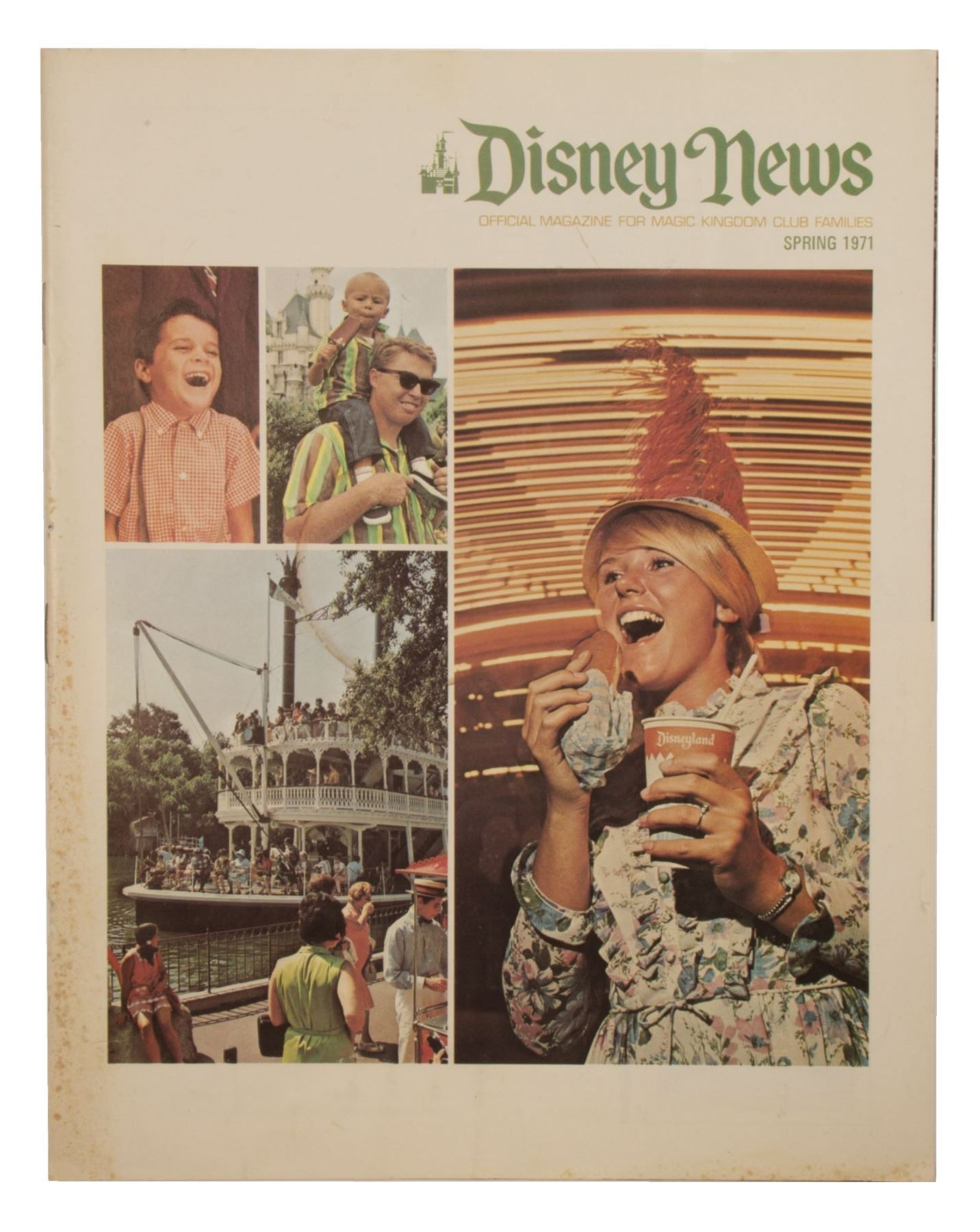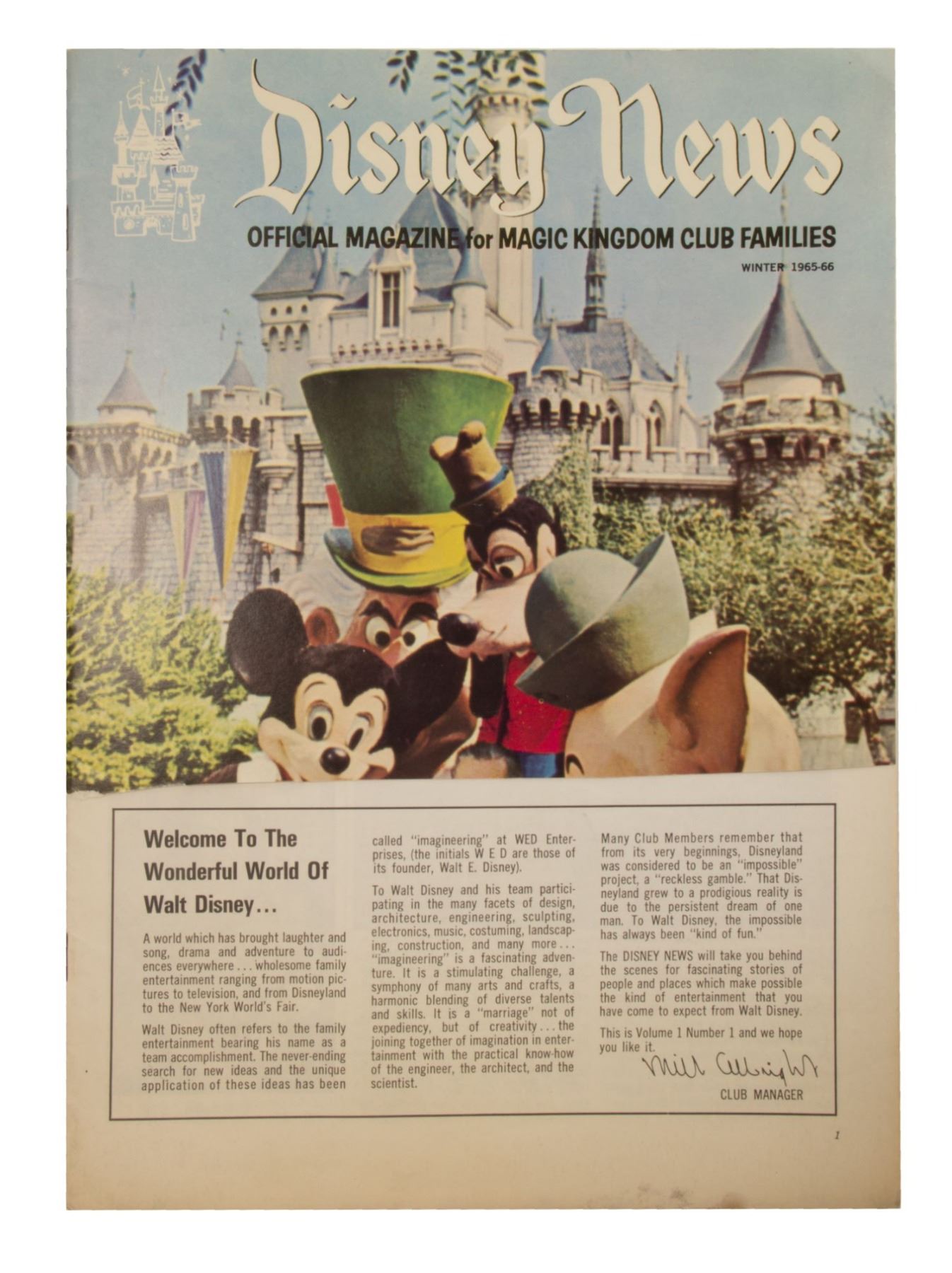 (Disneyland, 1962-72) A collection of (10) issues of Disneyland News and Disney News magazines, the official magazine for Magic Kingdom Club families. This collection spans from the very first issue in 1962 until 1972. There is an additional copy of the first issue with a note from the club manager stapled to the cover. The note is addressed to the club director and thanks them for their help in determining the look for the magazine. The magazines in this collection measure approximately 11"x8.5" each, and the set is in overall fair to good condition with varying amounts of wear throughout including a torn cover to the first issue of Disney News.