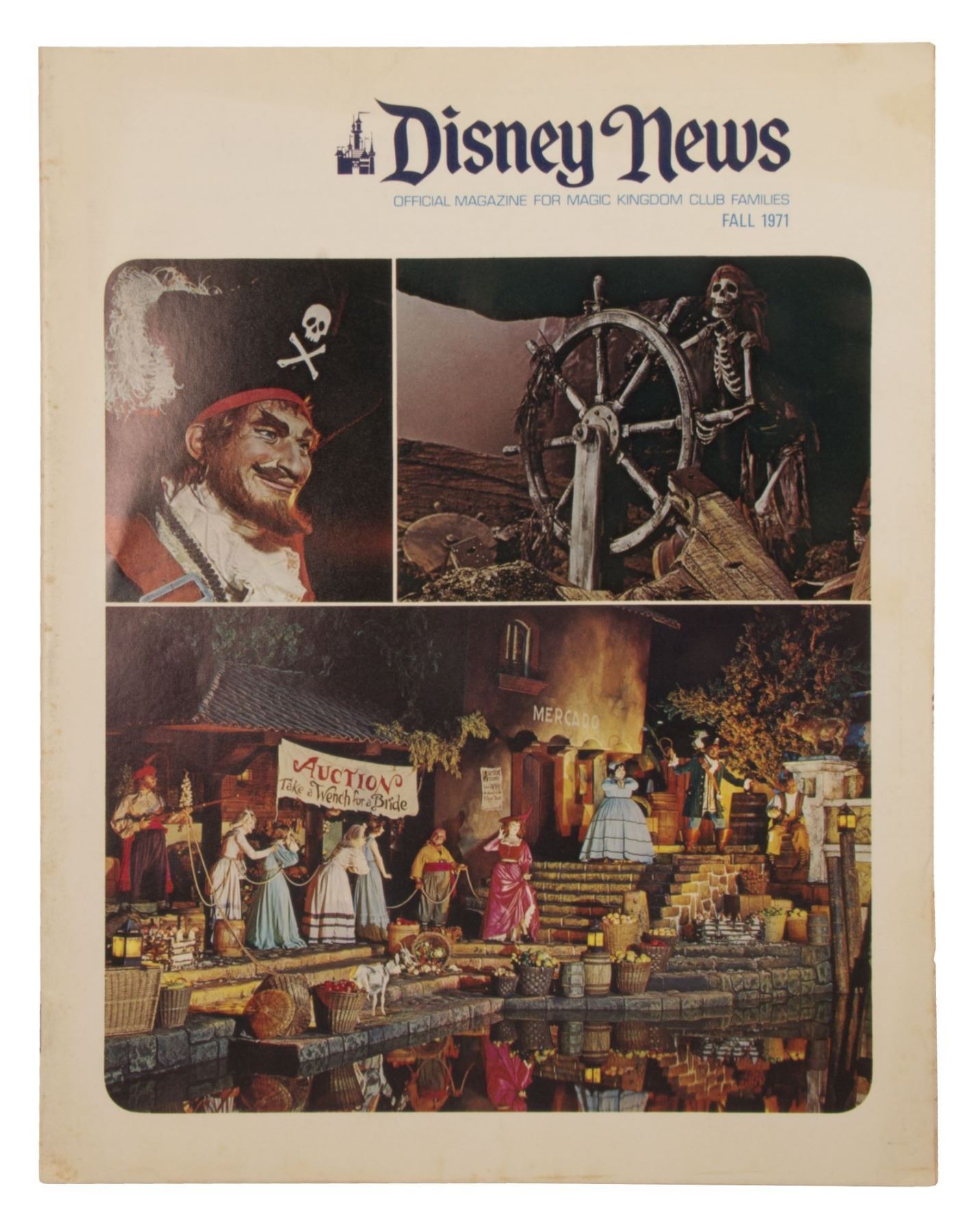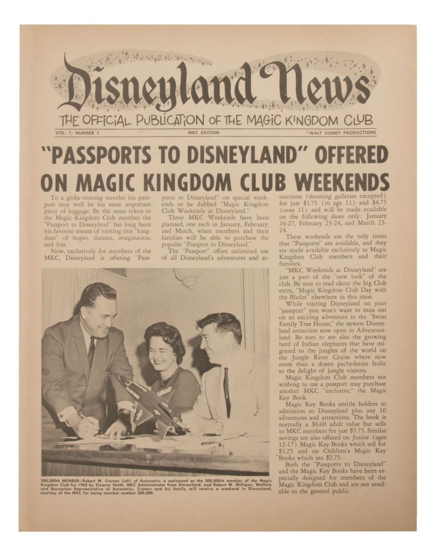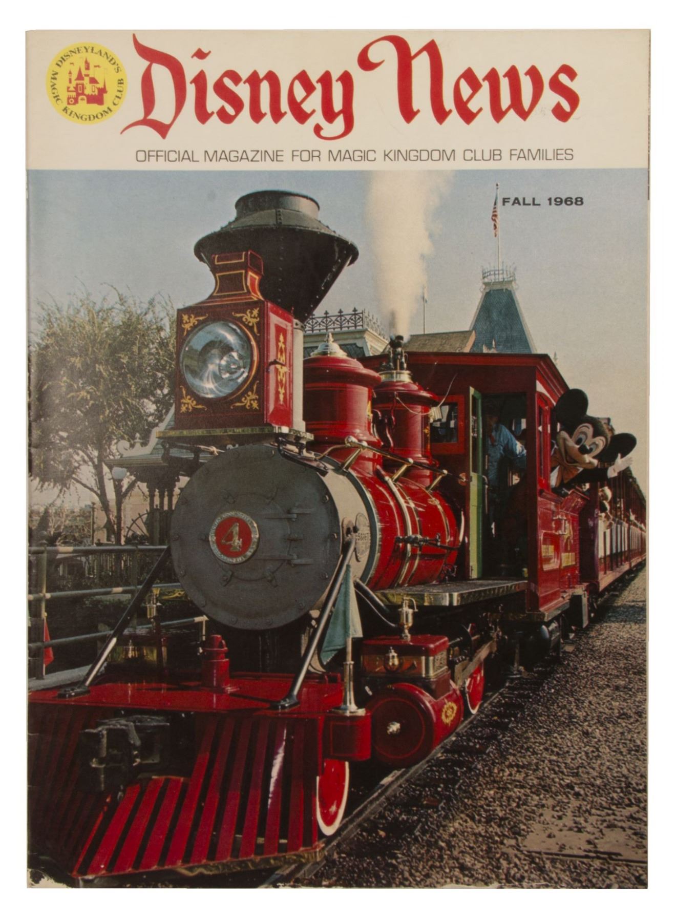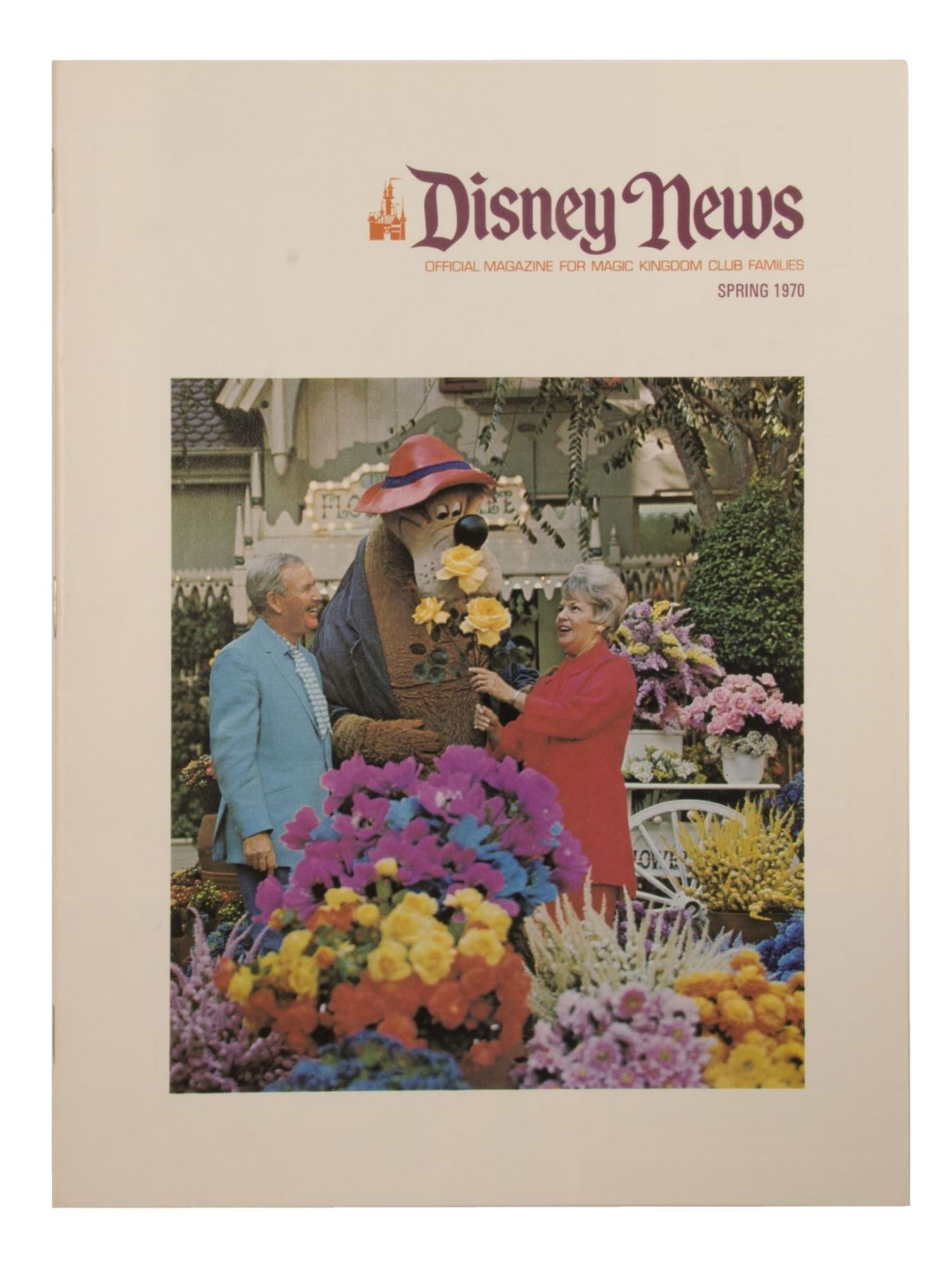(Disneyland, 1962-72) A collection of (10) issues of Disneyland News and Disney News magazines, the official magazine for Magic Kingdom Club families. This collection spans from the very first issue in 1962 until 1972. There is an additional copy of the first issue with a note from the club manager stapled to the cover. The note is addressed to the club director and thanks them for their help in determining the look for the magazine. The magazines in this collection measure approximately 11"x8.5" each, and the set is in overall fair to good condition with varying amounts of wear throughout including a torn cover to the first issue of Disney News.