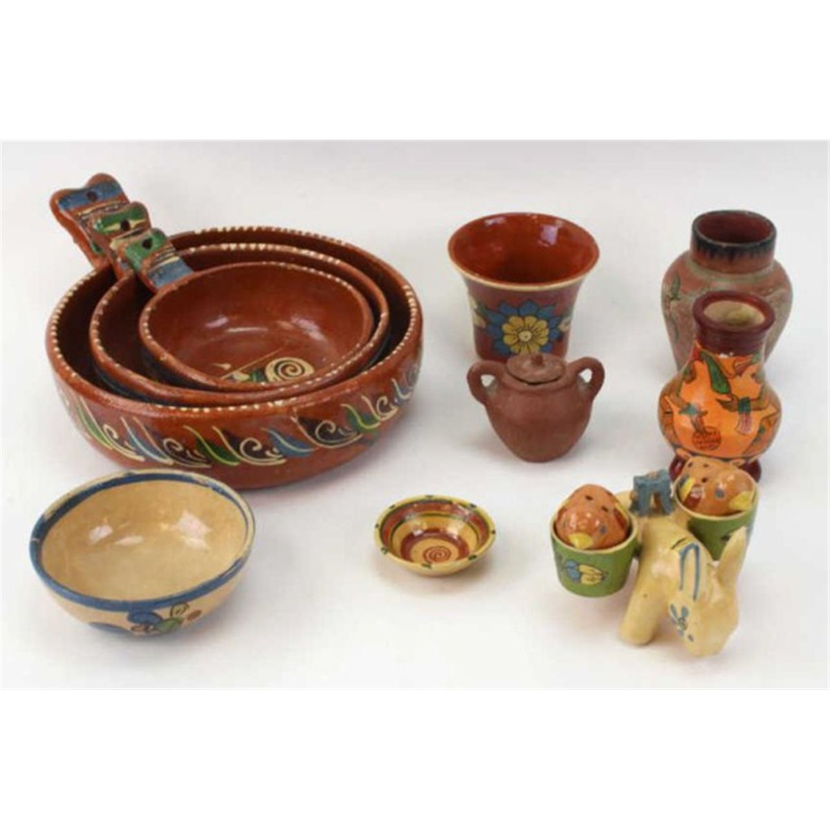 Collection of 10 Mexican pottery pieces including 1 set of hand painted nesting bowls, 1 donkey figurine that holds 2 chicken salt and pepper shakers, 1 two handled pot w/lid and 3 small serving bowls.