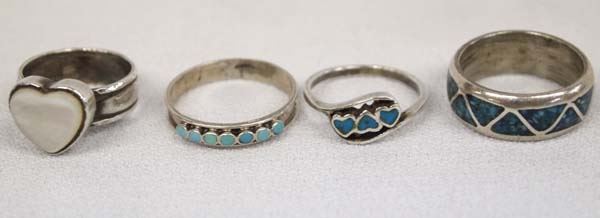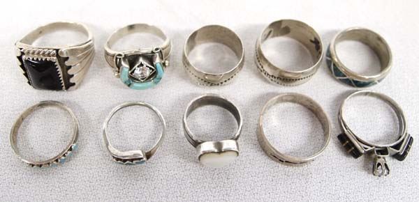 Collection of 10 Native American Navajo and Zuni Sterling Rings, sizes included 5, 5.5, 7.25, 7.5, 8, 8.5, 9, 10, 11, 9.25, multi-stones, 52.4g in total wt.