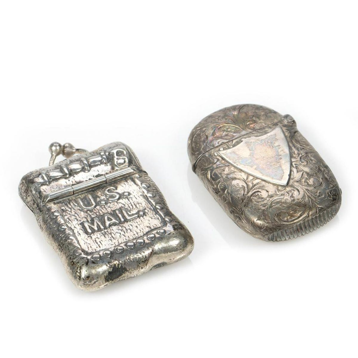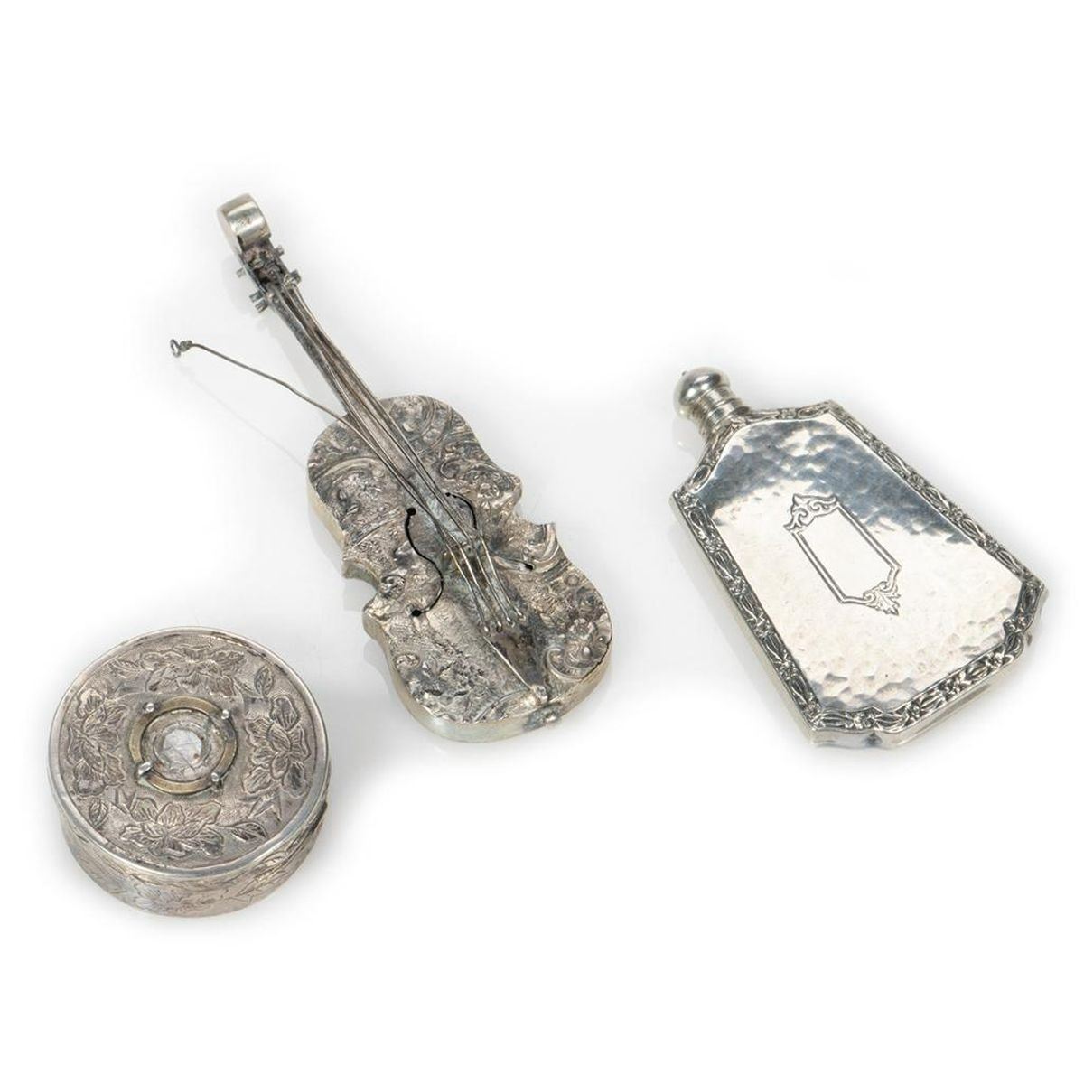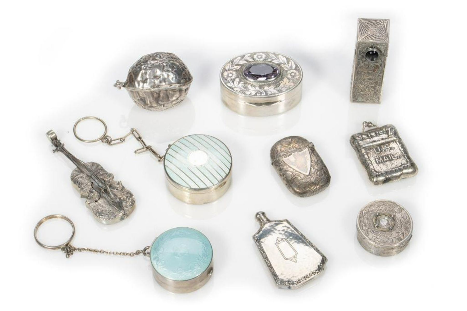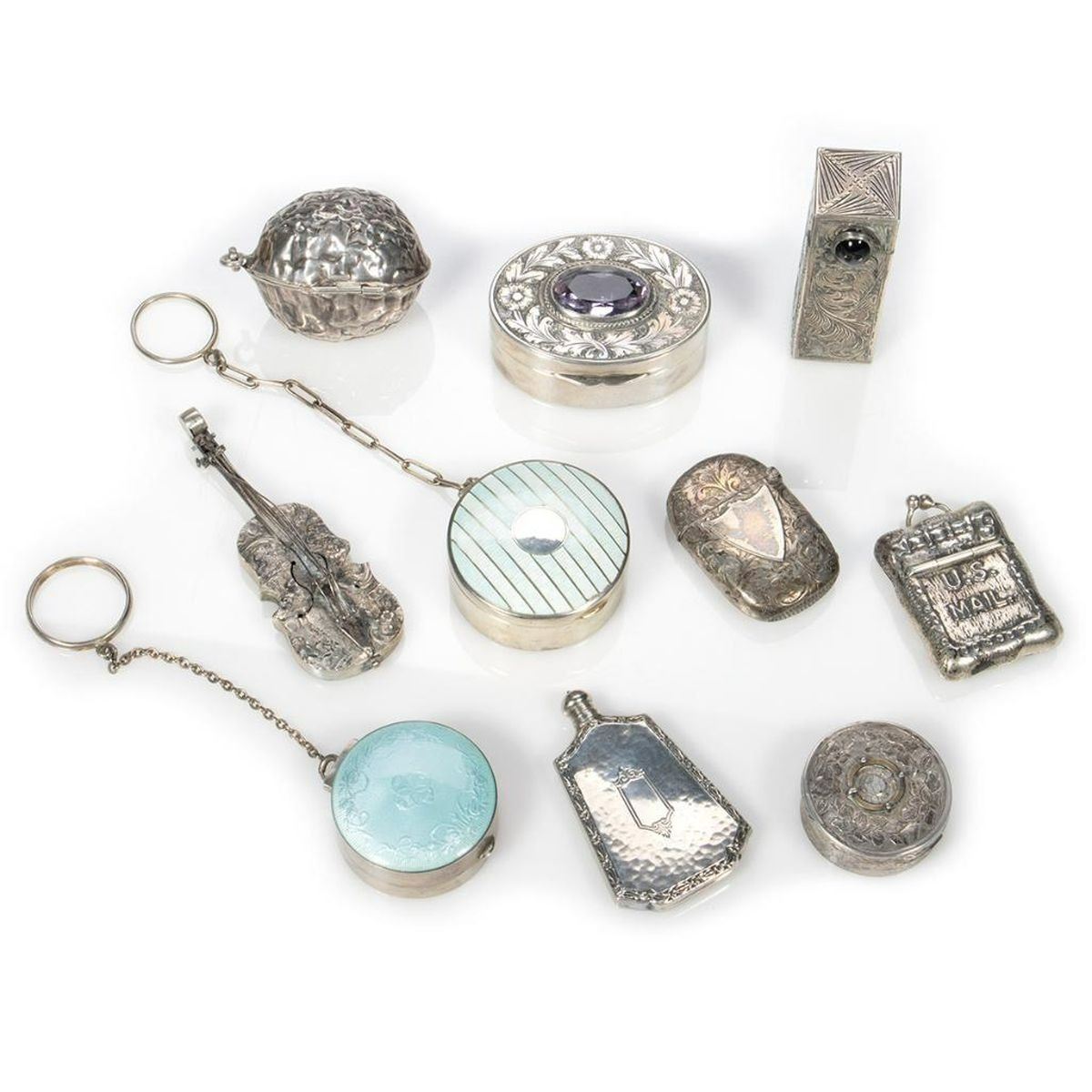 Comprised of a perfume flask with screw-top, marked "Sterling" (9 grams); a powder compact in the shape of a walnut; two pillboxes on key chains; a "jeweled" pillbox; a small pillbox marked "Silver/China" (missing "jewel" on top); a violin; a snap-top stamp case in the form of a mailbag; a lipstick case with a pop-out mirror; and a match case.