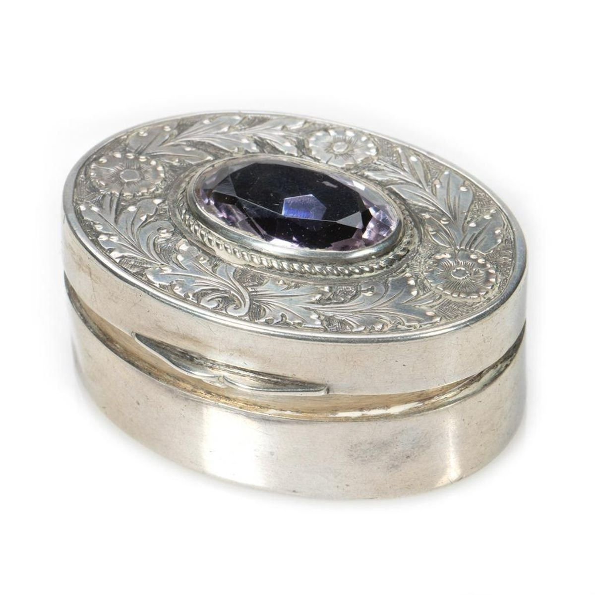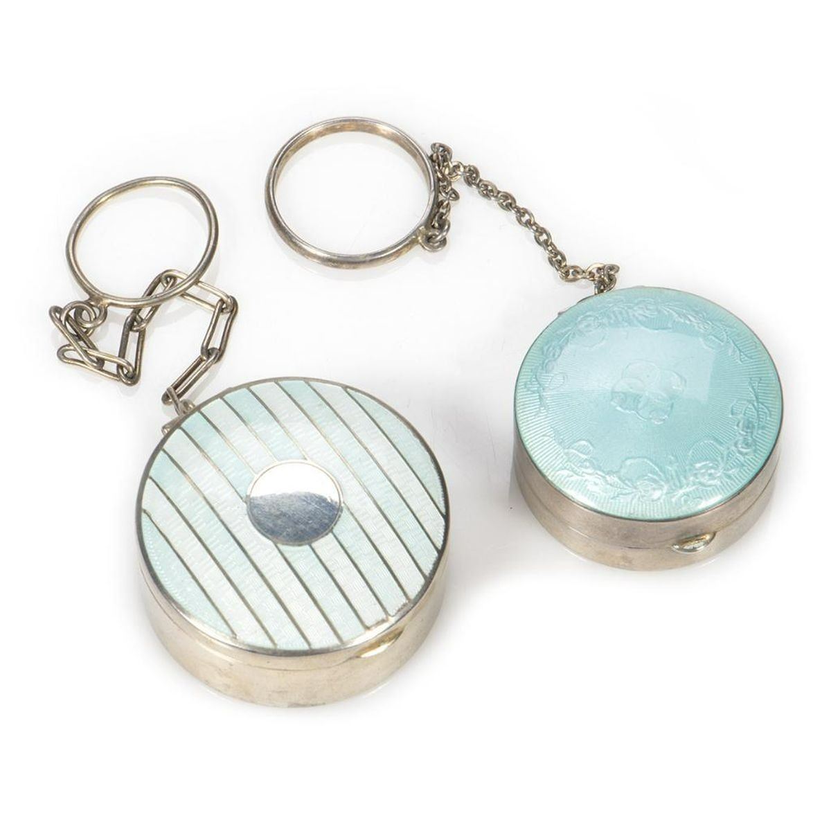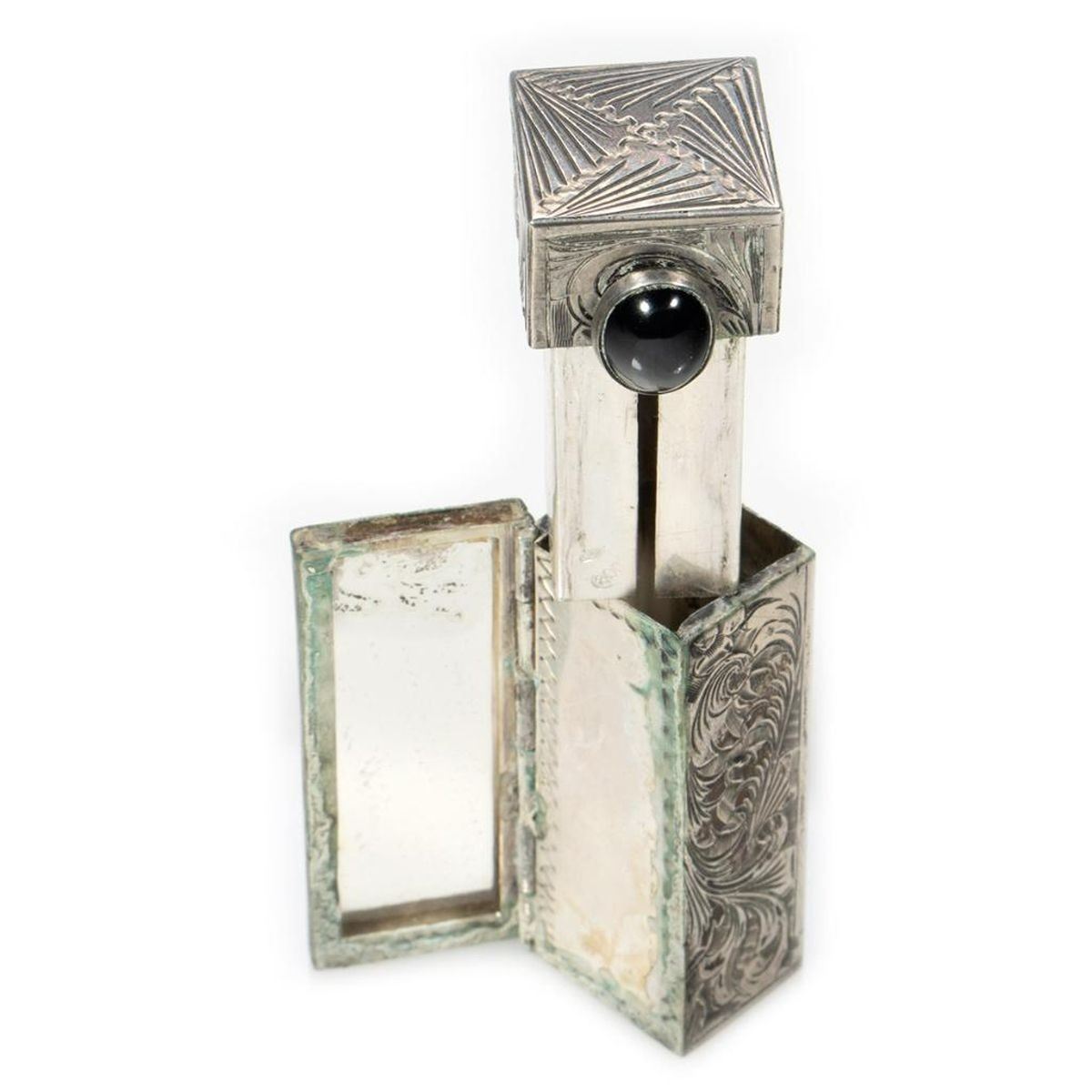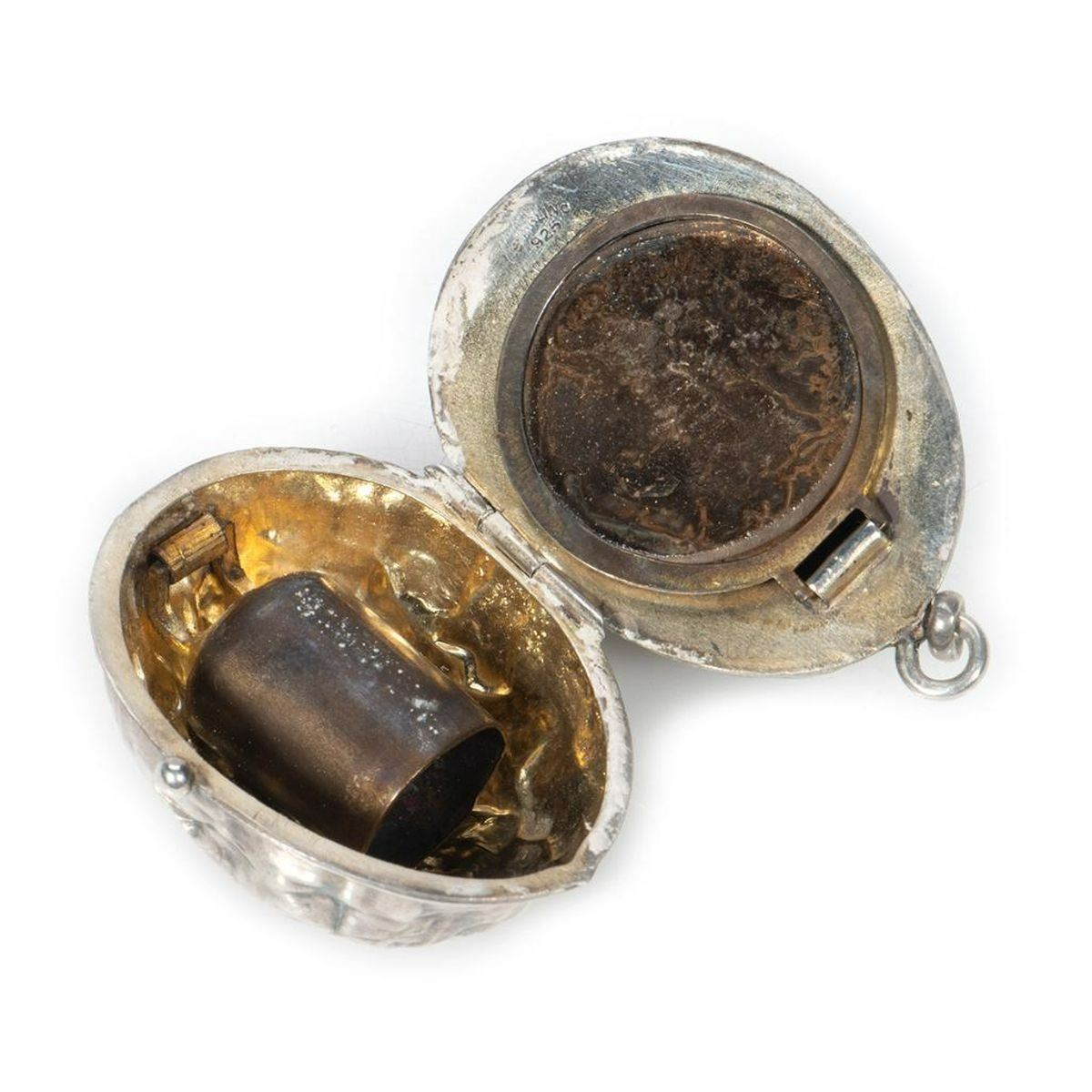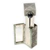 Comprised of a perfume flask with screw-top, marked "Sterling" (9 grams); a powder compact in the shape of a walnut; two pillboxes on key chains; a "jeweled" pillbox; a small pillbox marked "Silver/China" (missing "jewel" on top); a violin; a snap-top stamp case in the form of a mailbag; a lipstick case with a pop-out mirror; and a match case.
