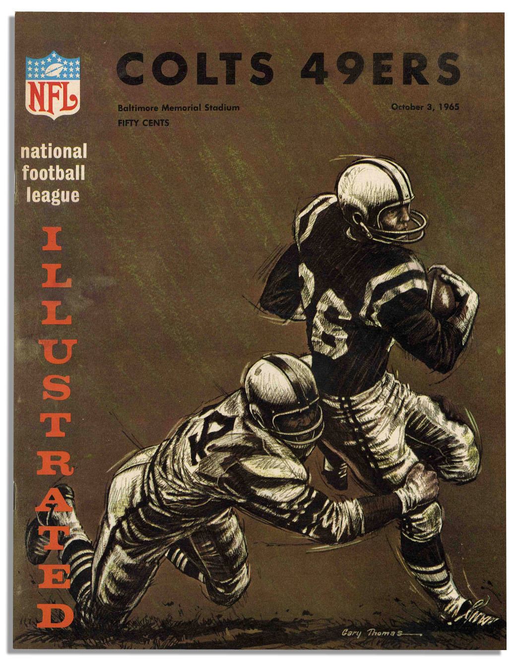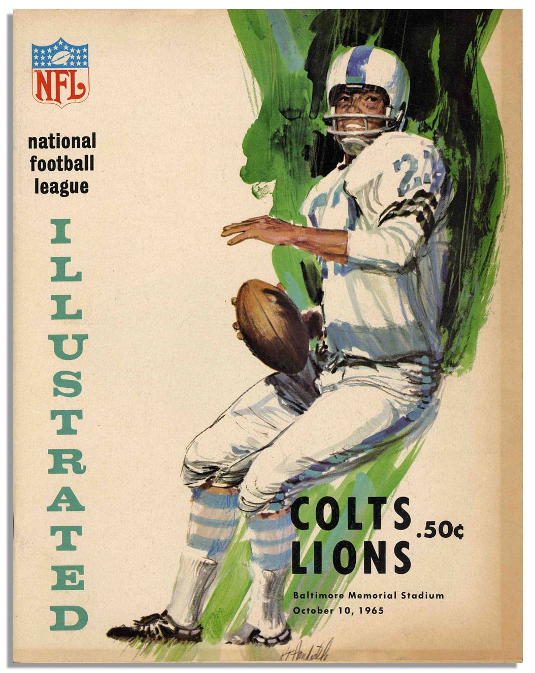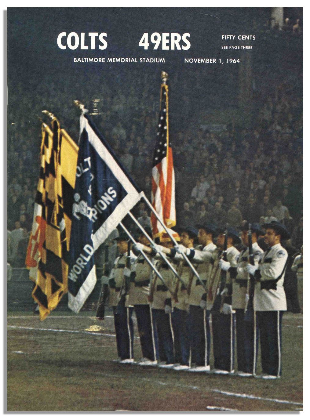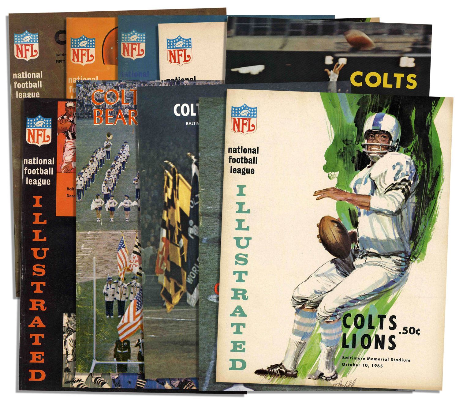 Colorful assortment of full programs from select Baltimore Colts games. Programs from home games held at Baltimore Memorial Stadium include those from the 1965 Colts vs. Lions, Vikings, Rams, Bears, 49ers, Packers and Lions games, as well as the 1964 Colts vs. 49ers, Cardinals and Lions. Each 8.5'' x 10.75'' program features photos, articles, and period advertising, and runs about 75pp. Light overall toning. All ten are in very good to near fine condition.