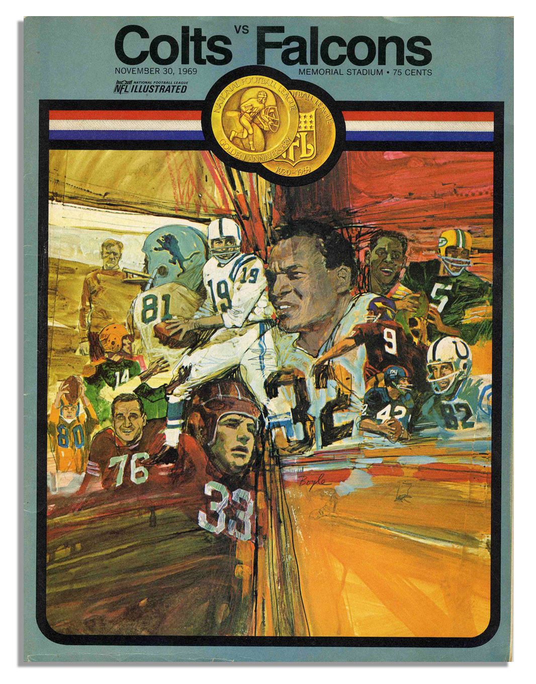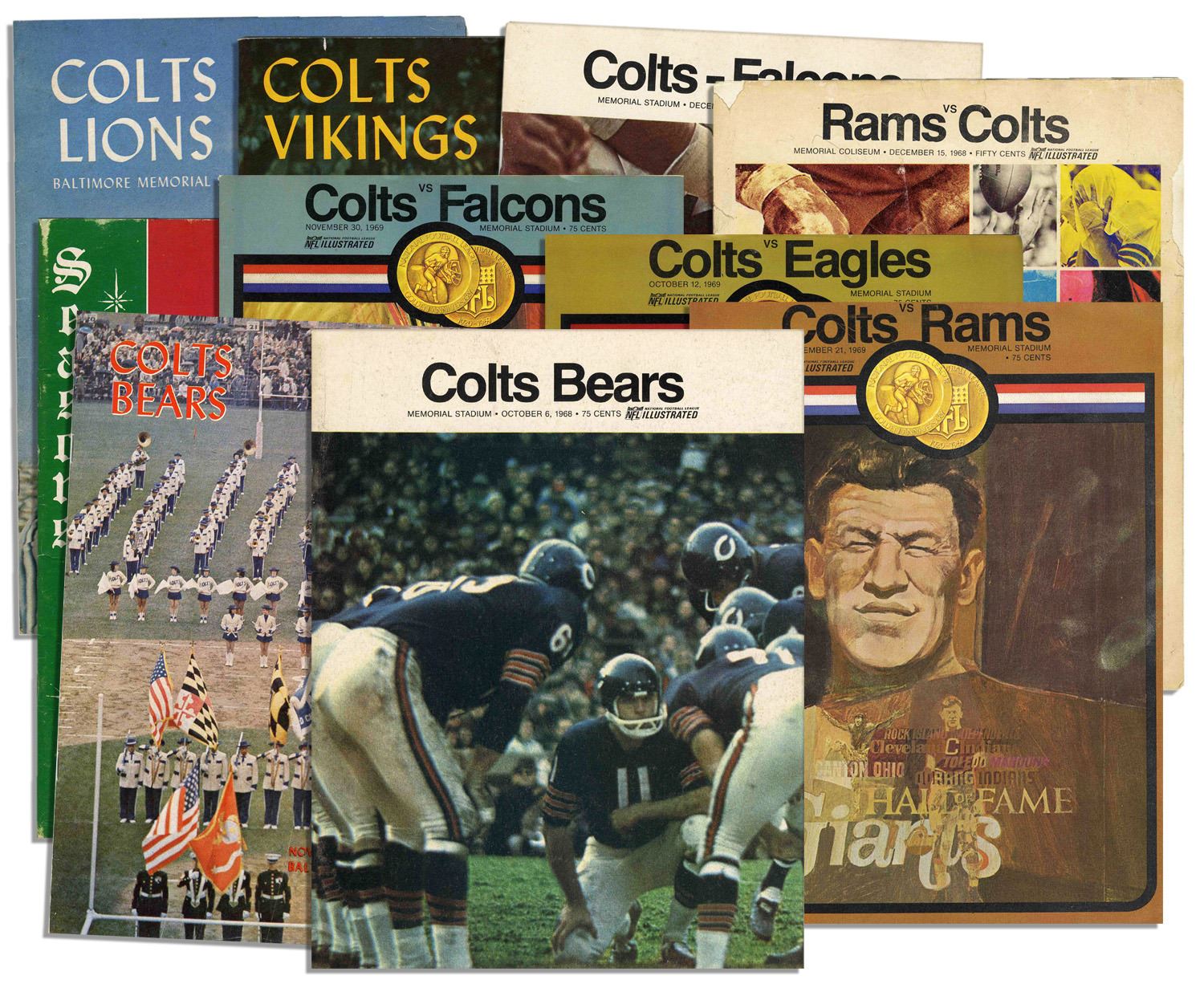 Colorful assortment of ten full programs from select Baltimore Colts games played in the 1960's. Programs from games played at Baltimore Memorial Stadium showcase the 1963 Colts versus the Bears, Lions, Vikings and Rams. Rams program has a season's greetings theme. Programs from 1968 are from Colts home games opposing the Bears and Falcons, with an additional program from the 1968 Rams game at Memorial Coliseum. 1969 Colts home games against the Eagles, Falcons and Rams are also included. A pair of 9'' x 7'' glossy black-and-white game shots are inserted into the 1963 Colts vs. Bears program. Each 8.5'' x 10.75'' program features photos, articles and period advertising, and runs about 75pp. Light overall toning. All are in very good to near fine condition.
