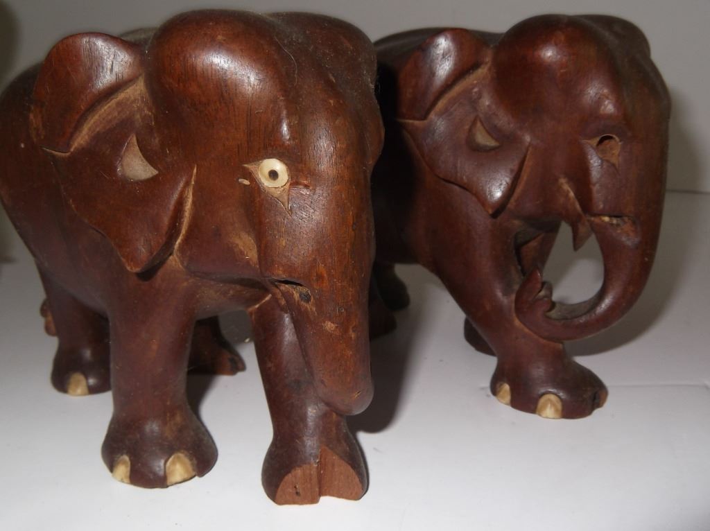 Collection of 10 elephant figures, including some made from wood, brass, pottery. Some lacking pieces. Largest measures 5 inches high.
