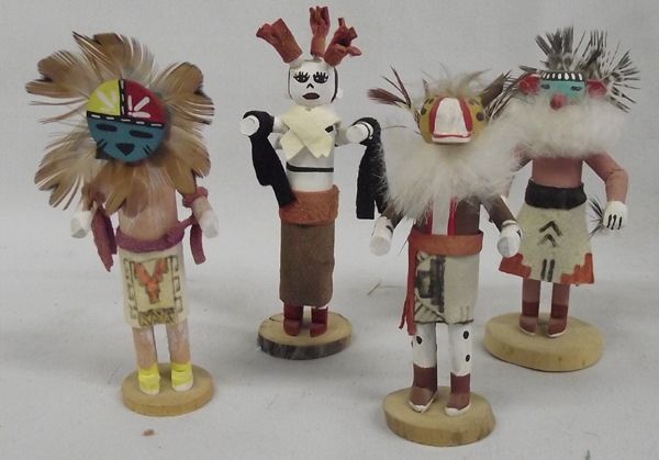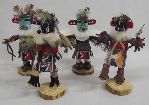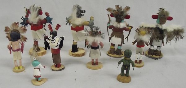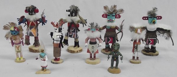 Collection of 10 miniature Navajo Kachinas. These brightly colored and feathered pieces are diverse in appearance and size. They measure approx 2''Tall to 4'' Tall and will be a great addition to your collection.