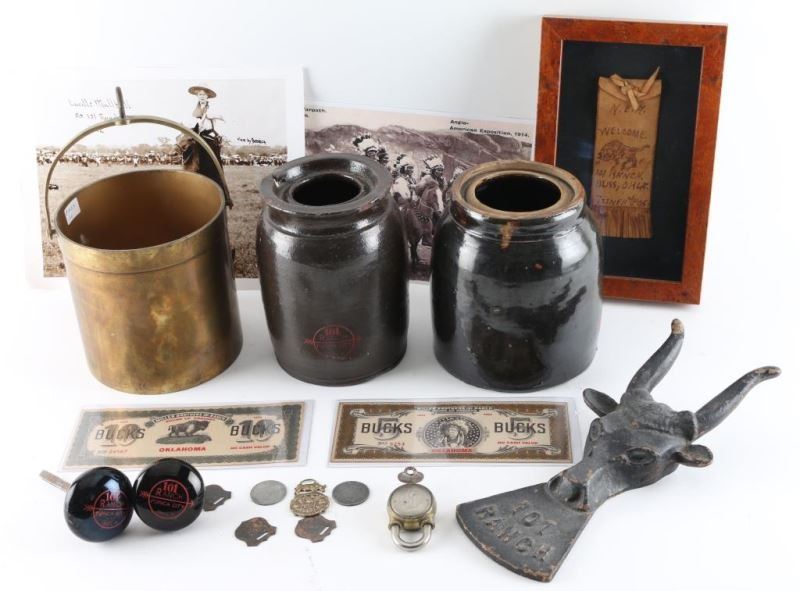 including 2 glass doorknobs, 101 marked padlock and key, shadowbox with leather coin purse that reads "Welcome 101 Ranch Bliss, Ok June 11 05", 101 Ranch marked steer head bootjack, several 101 Ranch postcards, photos. and Miller Bros 101 Ranch Bucks and First National Bank Indian Trader check , souvenir horse medallions and tags and two 101 Ranch marked 101 marked crocks one that has a brass carrier.