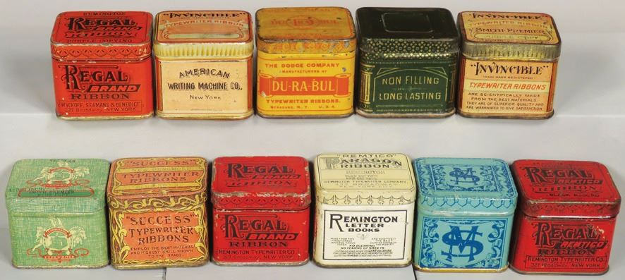 Collection of 11 Early CubeTypewriter Ribbon Tins including (3) Regal, (2) Invincible, Success, Manifold Supplies, Du-Ra-Bul and more. Overall fair to good condition. 2 X 1 3/4 X 1 1/2 inches.