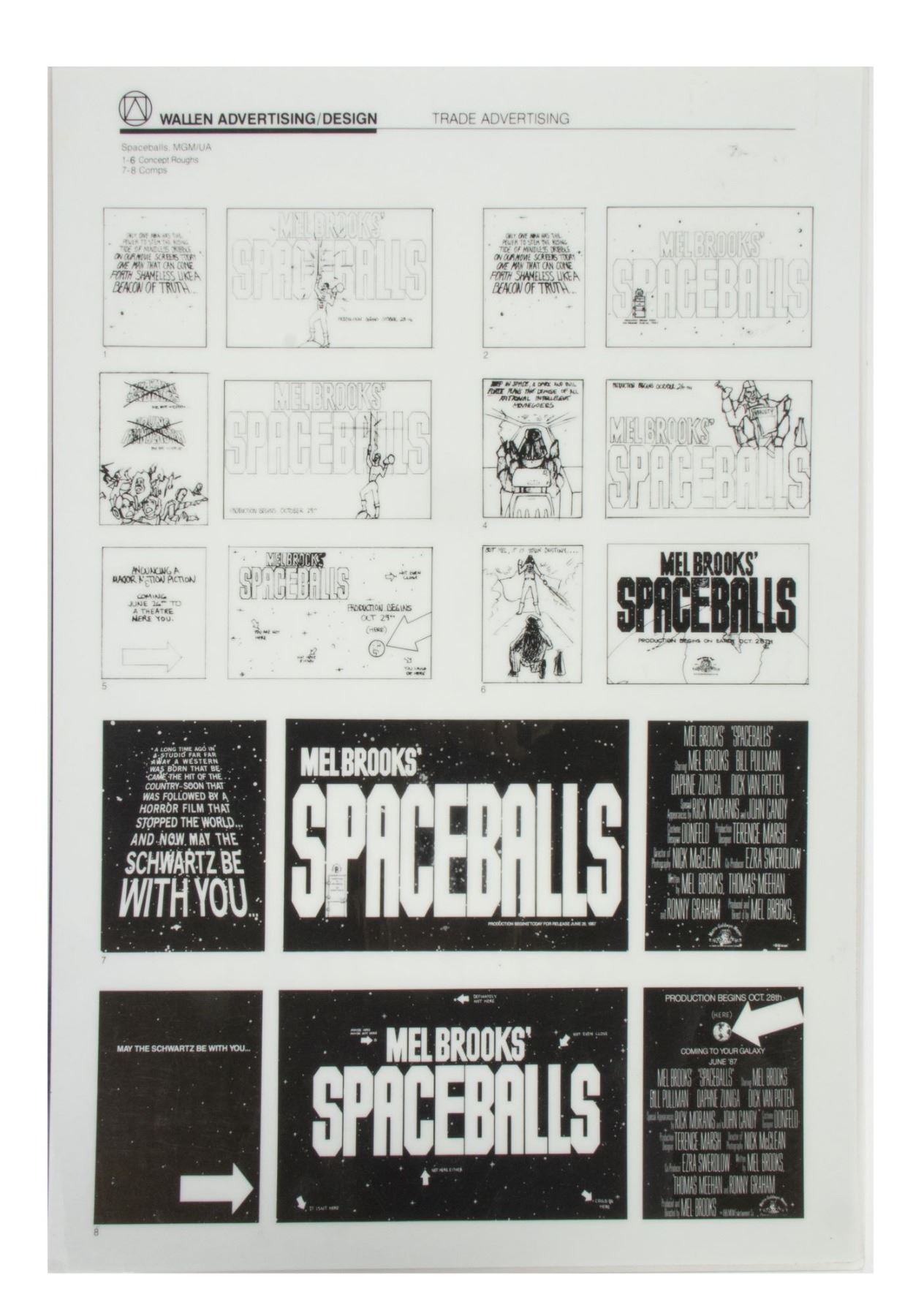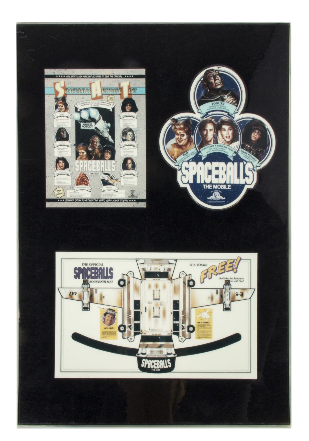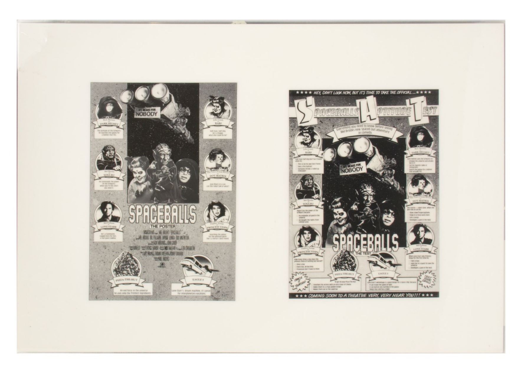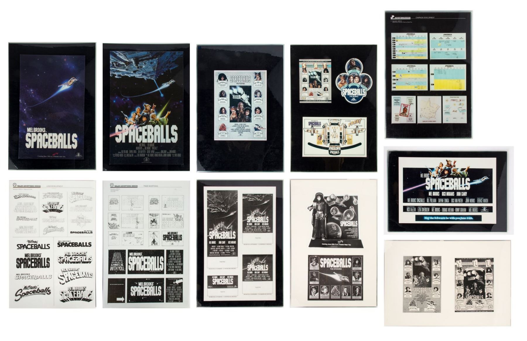 (MGM, 1987) A set of (11) printed and laminated reference cards from the collection of Bill Wallen that show the product designs, poster concepts, and other promotional materials from the theatrical release of "Spaceballs". Each laminated card measures 17.25"x12.25" and the condition is very good overall with minor wear from use.