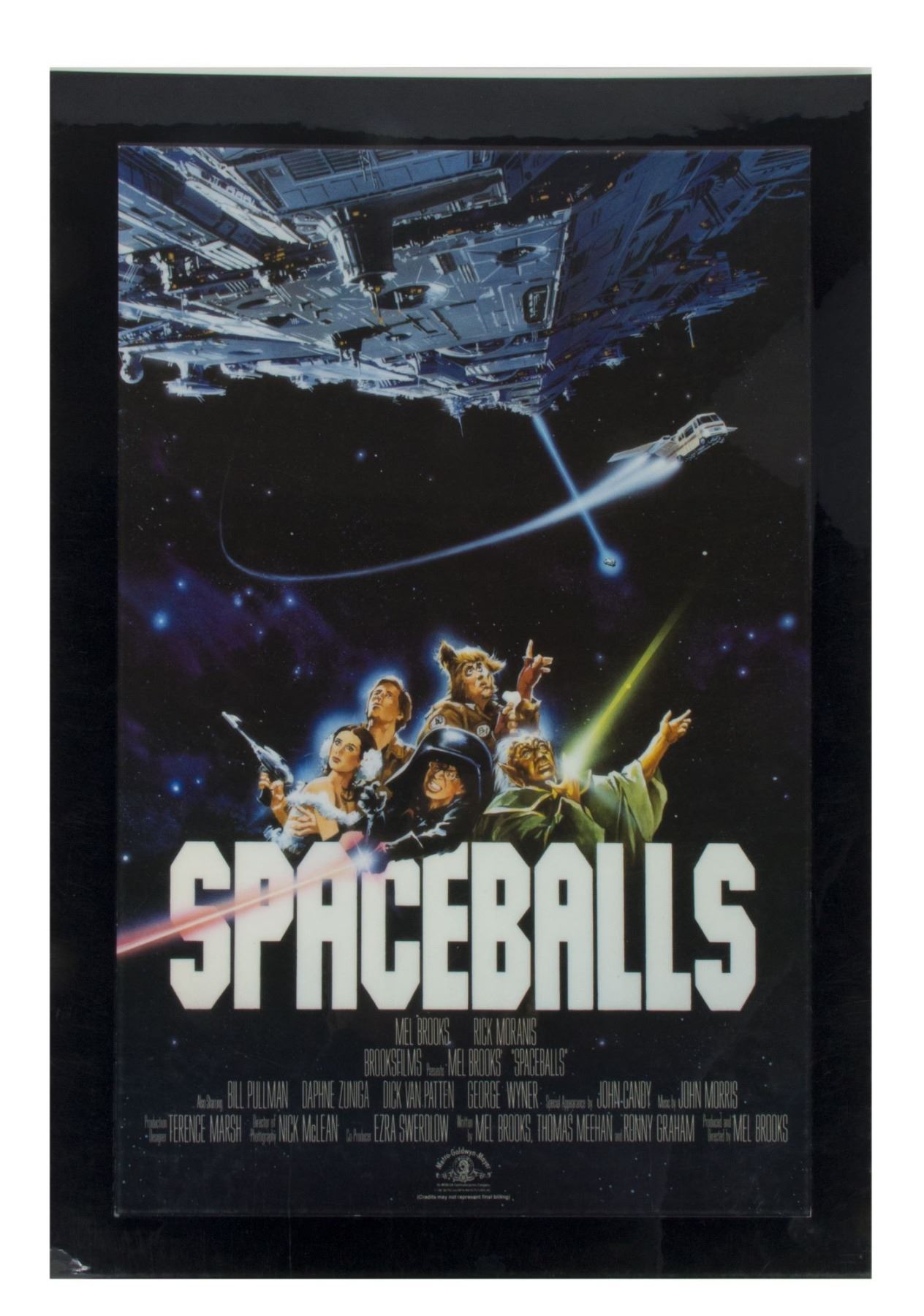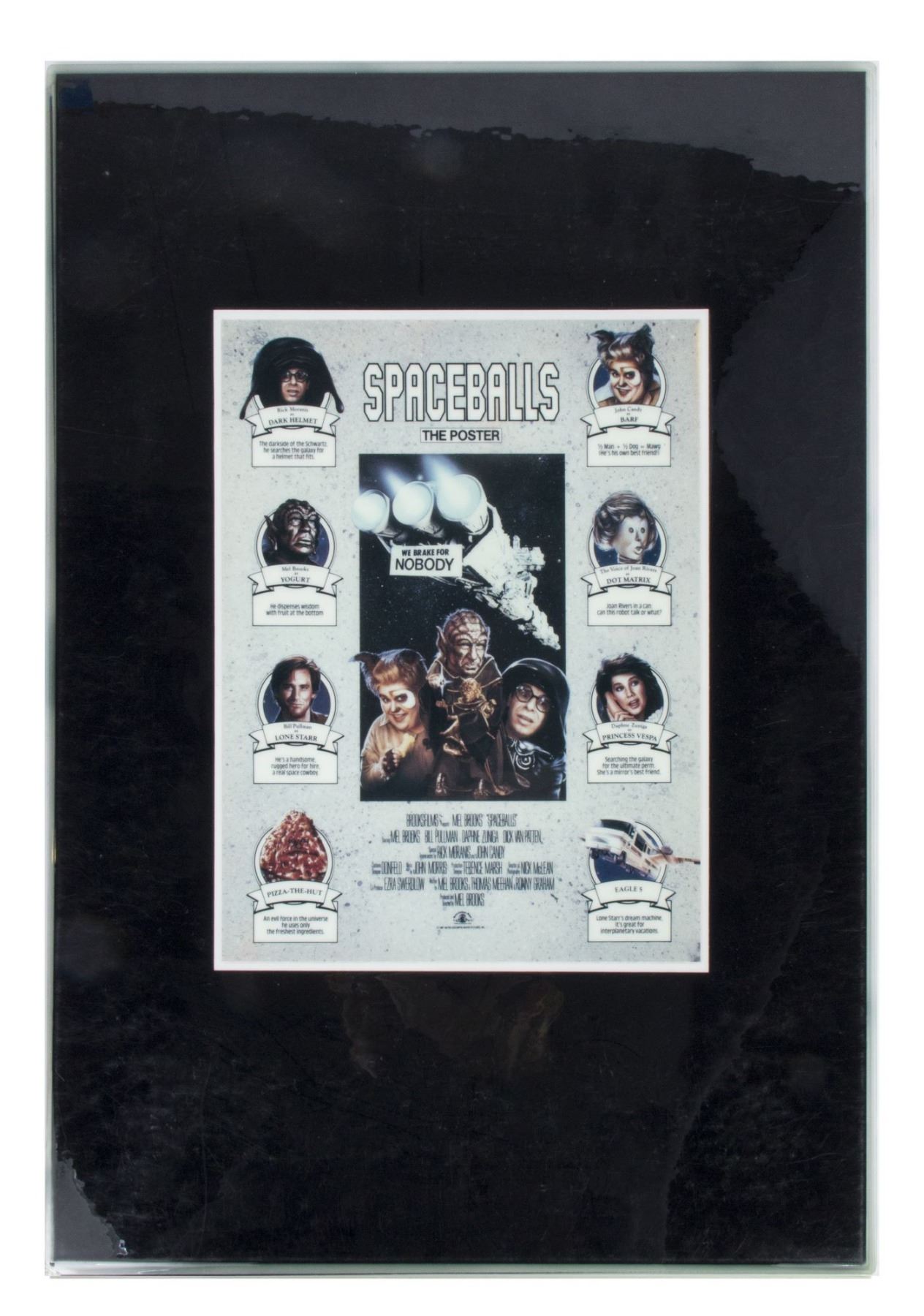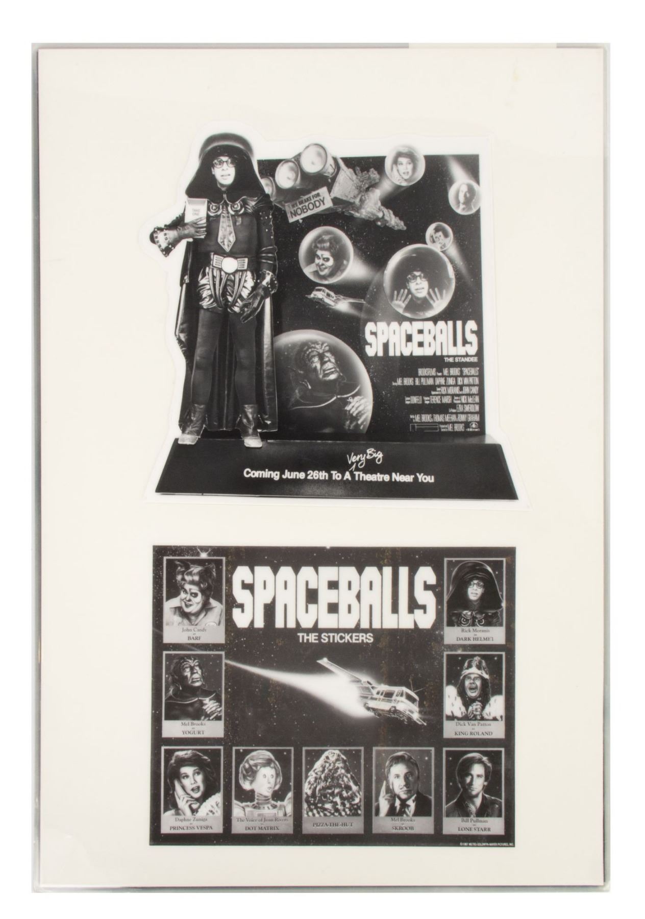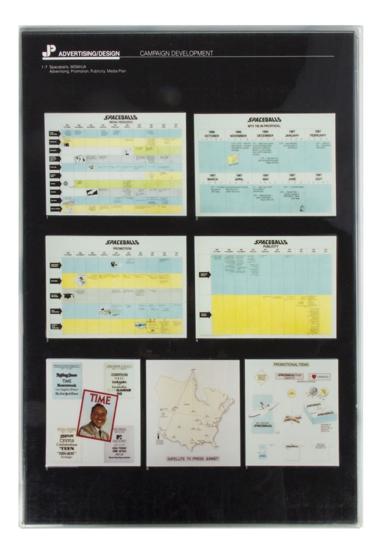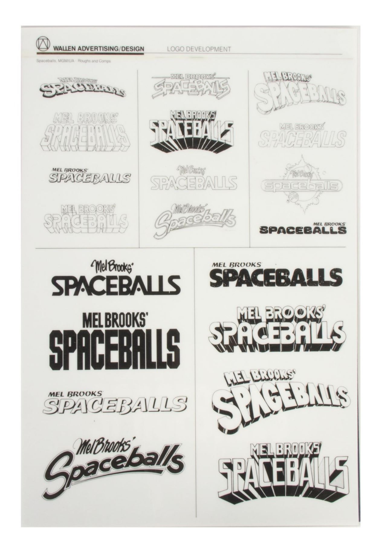 (MGM, 1987) A set of (11) printed and laminated reference cards from the collection of Bill Wallen that show the product designs, poster concepts, and other promotional materials from the theatrical release of "Spaceballs". Each laminated card measures 17.25"x12.25" and the condition is very good overall with minor wear from use.