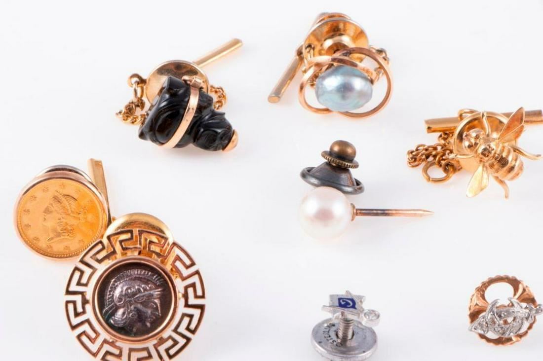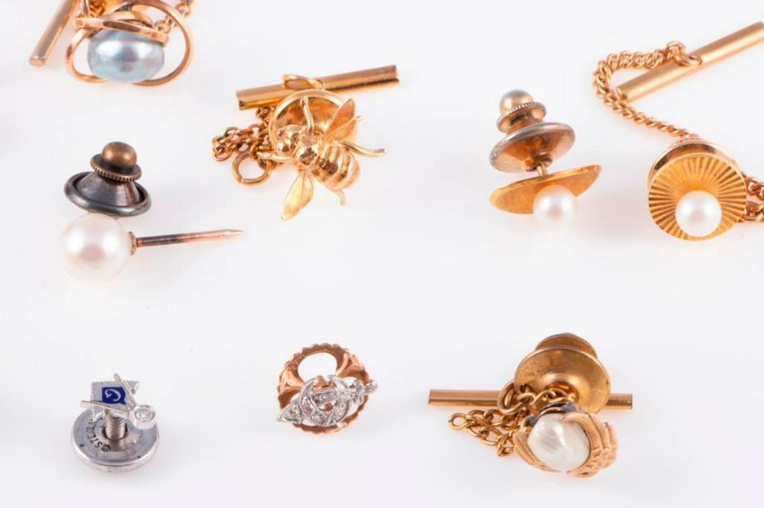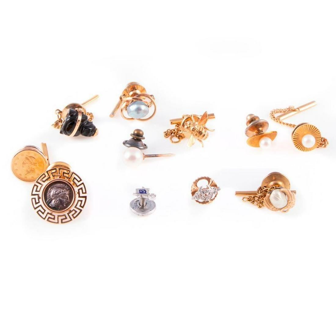 in 14k, 10k and 9k gold; set with diamond, cultured pearl and onyx; single and round brilliant-cut diamonds weighing approximately: 0.07ct.; gross weight approximately: 16.1 grams Items are sold as is. Please inquire about condition if not otherwise stated.