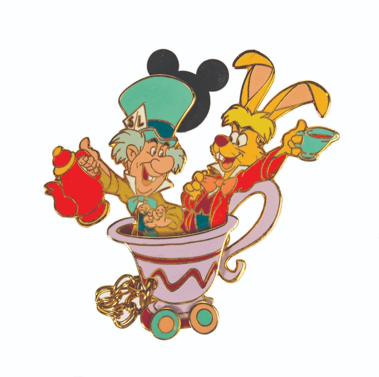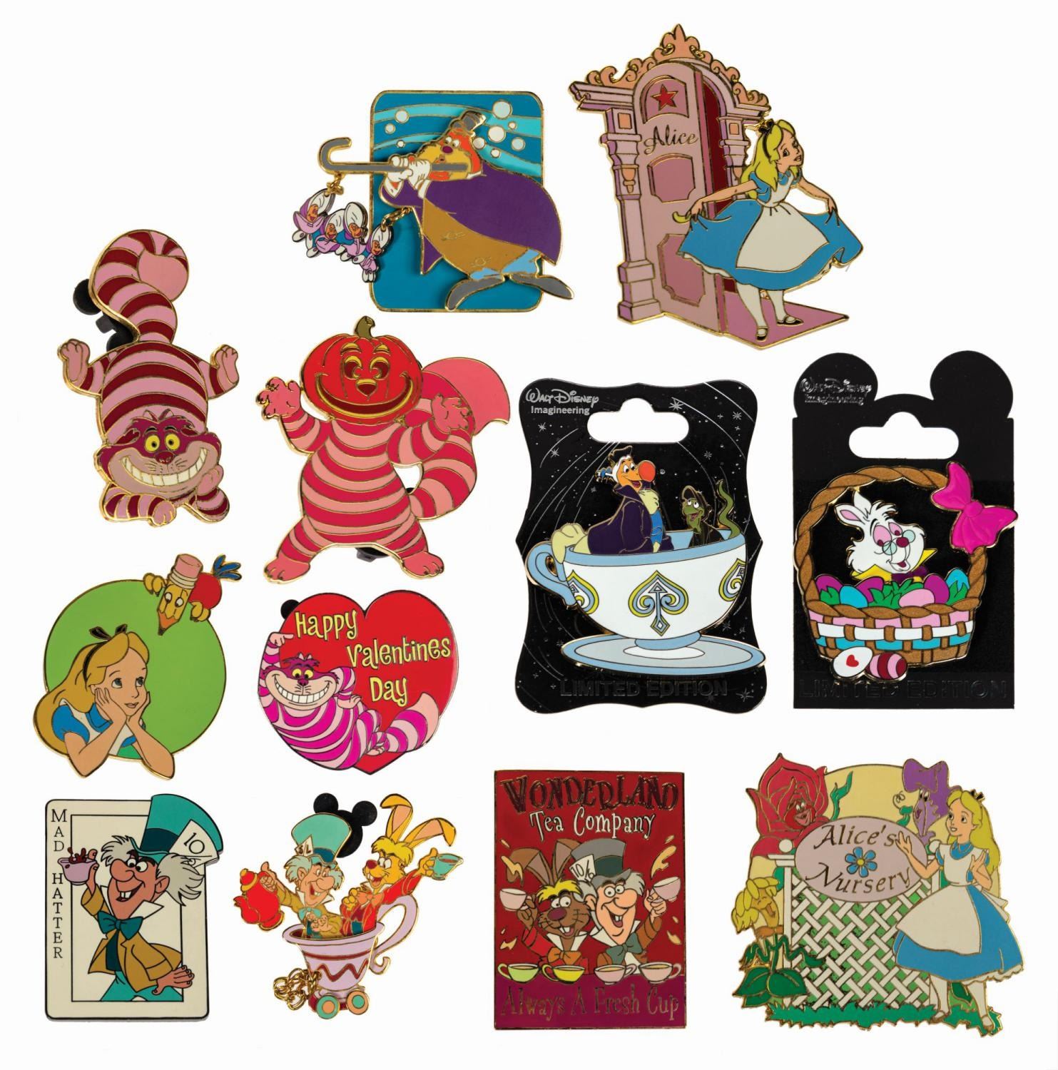 (Disneyland, 2003-15) A collection of (12) Alice in Wonderland limited edition pins. The grouping includes (8) Disney Auctions pins, (2) Imagineering pins, a Disney Cruise Lines pin, and a Disneyland Paris pin. Eight are from an edition of 500, the Disneyland Paris pin is marked 406/900, and the remaining (3) pins are from smaller editions. The collection features characters such as Alice, the Cheshire Cat, the Mad Hatter, the White Rabbit, and more, with scenes related to both the film and the parks. Ranging from 1.75"x2" to 2.5"x1.75", the pins are in very good condition with minor surface wear, including some spots of tarnish on the outlines. Two of the pins are on their original backing.