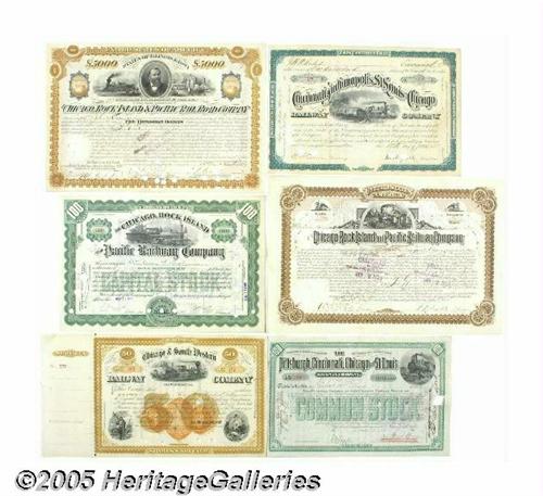 <B>Collection of 12 Chicago Railroad Stocks and Bonds</B></I> Includes the following: 1. Chicago, Rock Island & Pacific Railway Company, stock, Illinois, Iowa, 1915. 2. Chicago & South Western Railway Company, stock, Iowa, Missouri, with great imprinted revenue, 1870s. 3. Cincinnati, Indianapolis, St. Louis & Chicago Railway Company, stock, Indiana, 1880. 4. Cincinnati, LaFayette & Chicago Railroad Company, stock, Ohio, Illinois, 1876. 5. Columbus, Chicago & Indiana Central Railway Co., stock, Ohio, Indiana, Illinois, 1868. 6. Columbus, Chicago & Indiana Central Railway Co., stock, Ohio, Indiana, Illinois, 1880. 7. Pittsburgh, Cincinnati, Chicago & St. Louis Railway Co., stock, Pennsylvania, West Virginia, Ohio, Indiana, Illinois, 1897. 8. Chicago & Eastern Illinois Railway Company, bond, Illinois, 1921. 9. Chicago & Erie Railroad Company, bond, New York, 1890. 10. Chicago, Rock Island & Pacific Railway Company, bond, Illinois, Iowa, 1887. 11. Chicago, Rock Island & Pacific Railway Company, bond, Illinois, Iowa, 1887. 12. Cleveland, Cincinnati, Chicago & St. Louis Railway Company, bond, Ohio, Indiana, 1893. An exceptional collection of 12 Chicago stocks and bonds. All appropriate for framing and in excellent condition. Lot:253