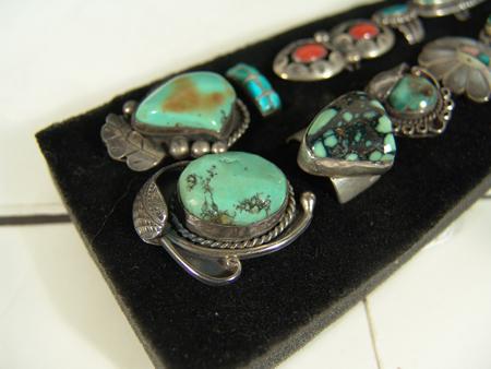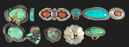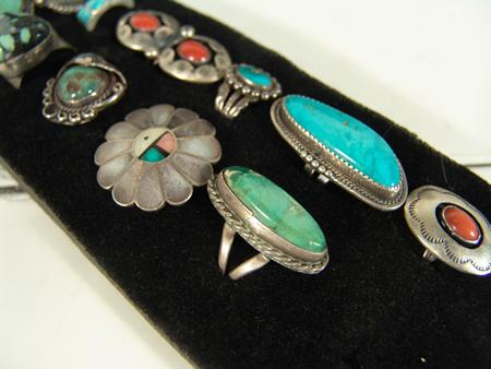 Outstanding collection of 12 Navajo and Zuni rings of turquoise and coral, some with hallmarks. Various sizes