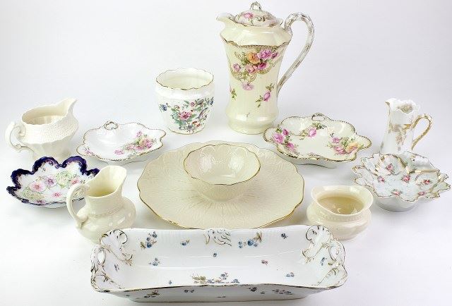 fine Bavarian German Cofffe pot with lid, miniature Limoges handled pitcher 4" tall, Lenox cream and sugar, Spode creamer and more. Frawley Estate items. Est. 75-150