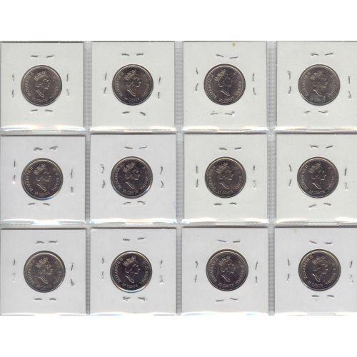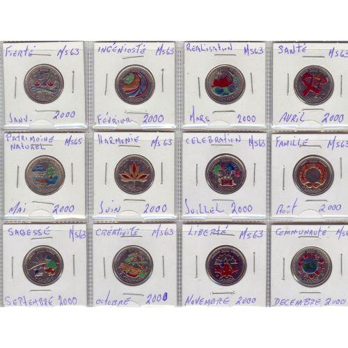 Collection of 12 x 25 Cents 2000 Colored Nickel Commemorative in 2 x 2, Each coin represent a Different value important to Canadian, coloring not made by the mint. To be viewed, sold as is no return.