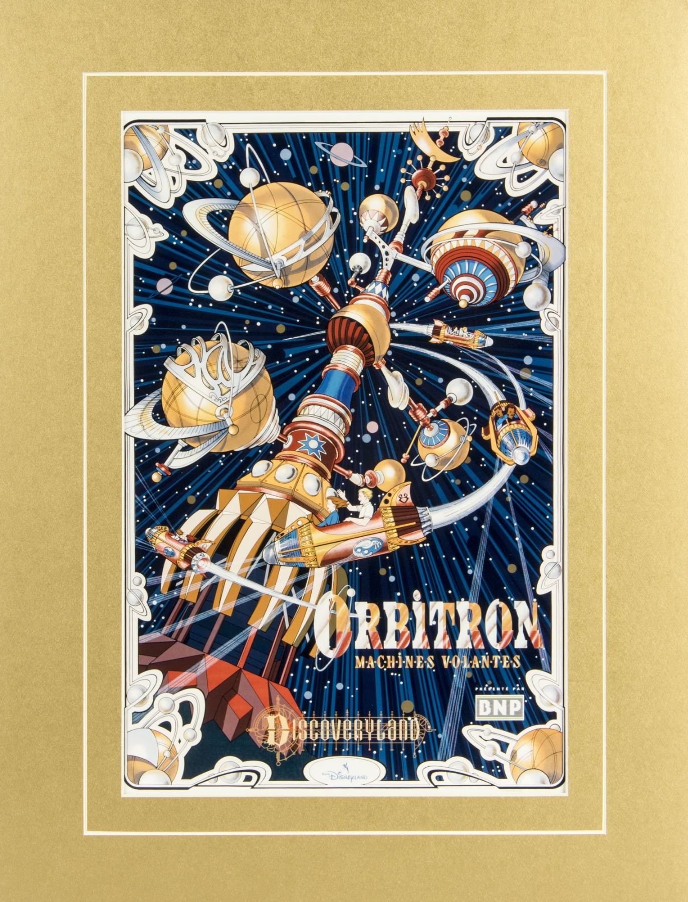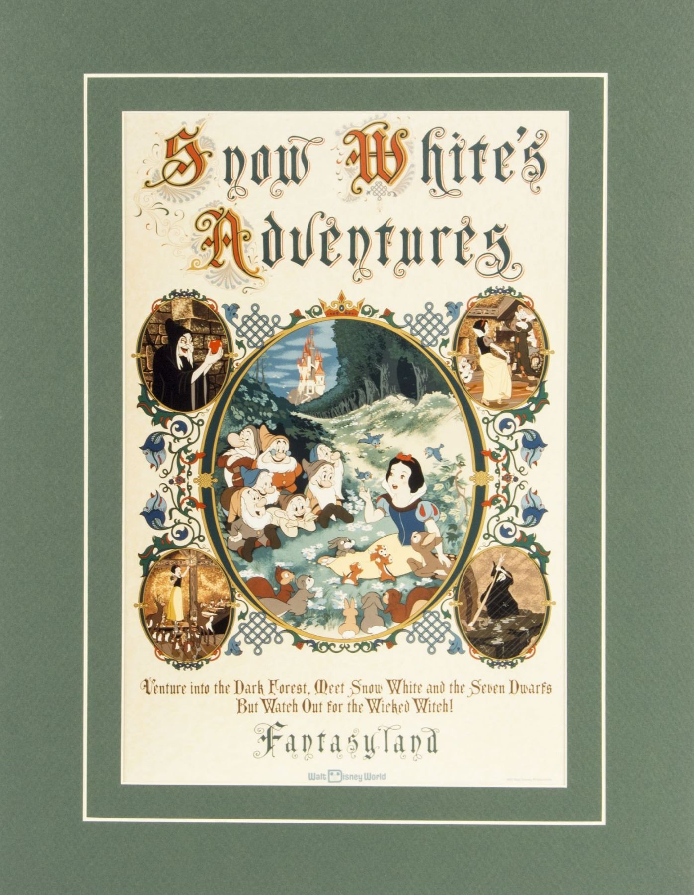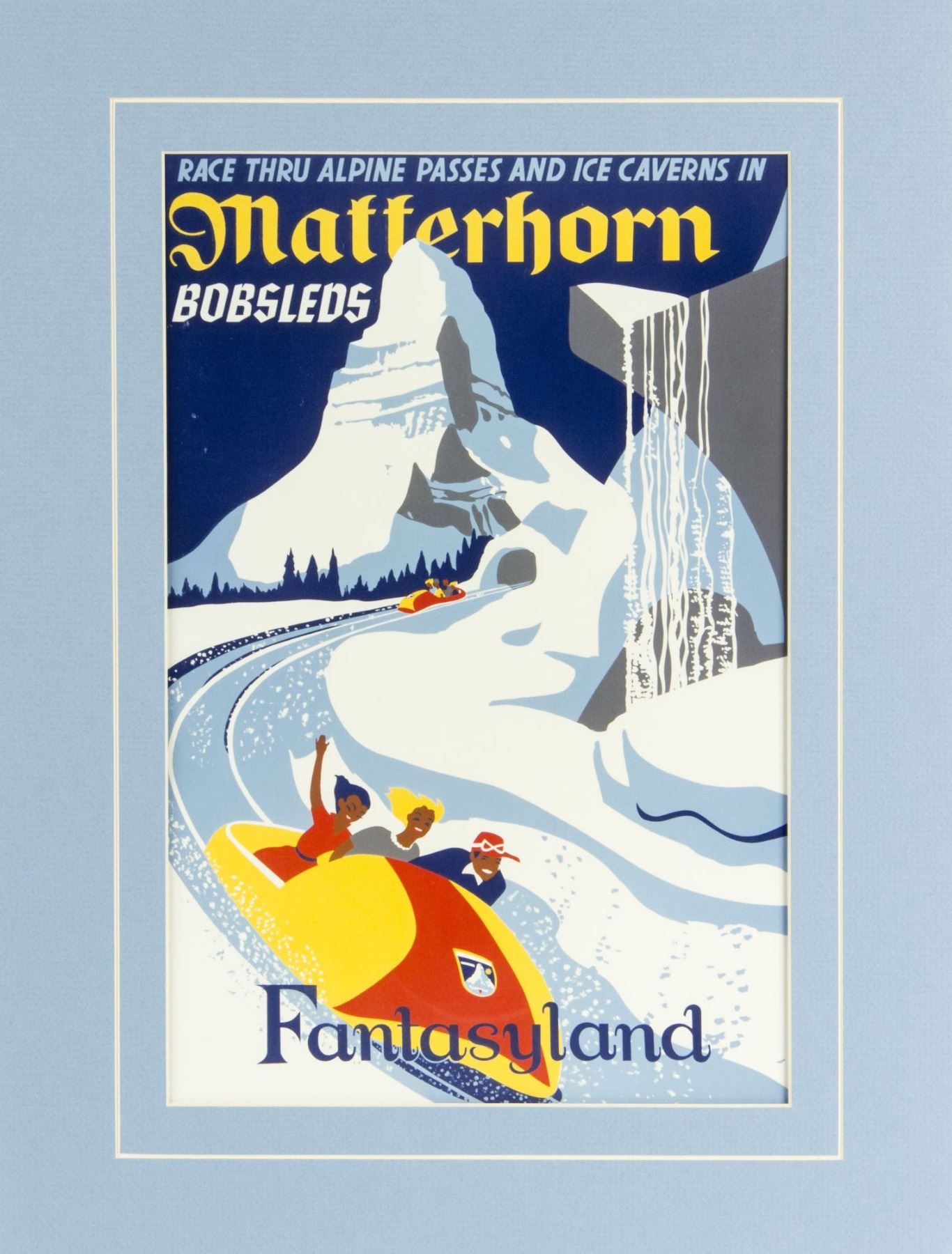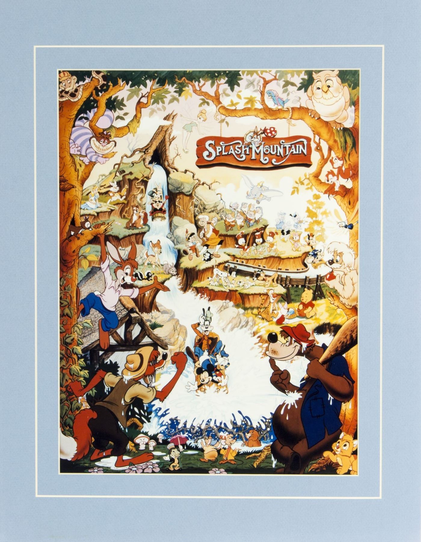 (Disneyland, c.2000s) A collection of 13 attraction poster prints from the Disney Gallery. This collection of poster artwork includes some of the most beautiful posters from Disneyland, Walt Disney World, and Euro Disneyland. Each print comes matted as sold in the Disney Gallery, and bears a Disney copyright stamp on its foam core backing. Each print measures 18"x14" matted, and the set is in overall fine condition with minor spots of wear throughout.