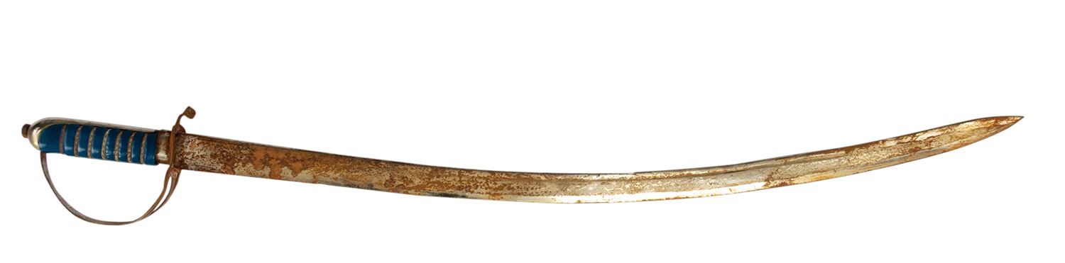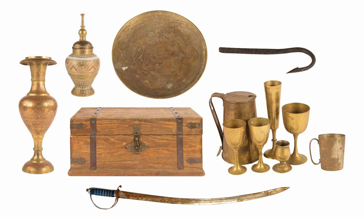 (Walt Disney World, c.1980s-90s) An impressive collection of (13) prop items from the Pirates of the Caribbean attraction at Walt Disney World. The collection includes a chest, sword, hook, (2) urns, a small platter, and (7) drinking vessels. Ranging in size from a 2.75" tall cup to the 35" sword, these items are in good condition with expected wear from display. Most items display rust or tarnish from the humid environment of the ride, with surface wear on most. There is some scratching and chipping to the surface of the chest.
