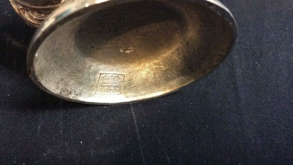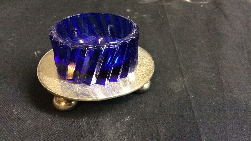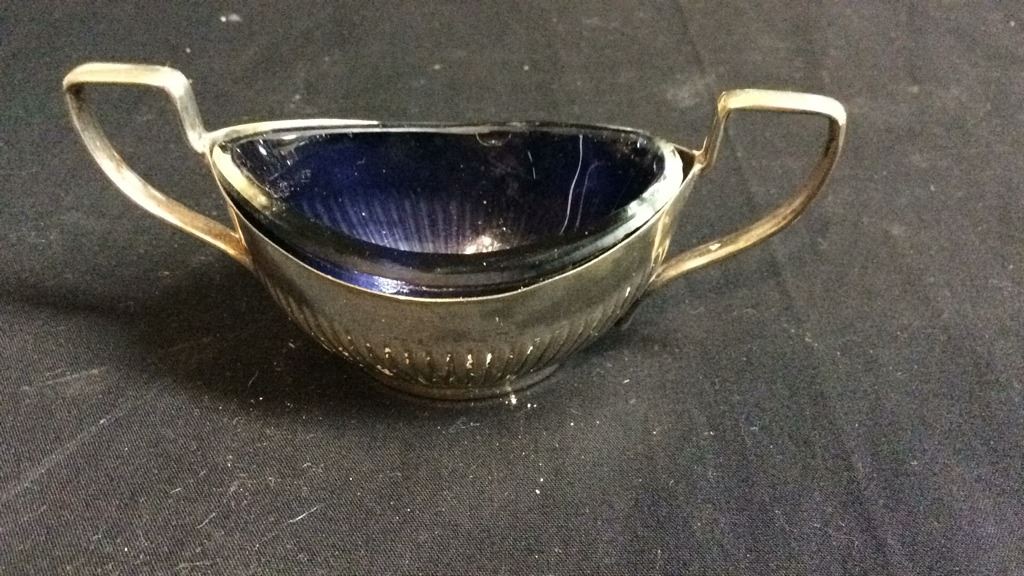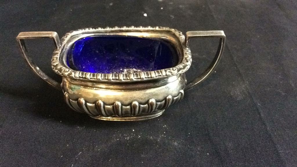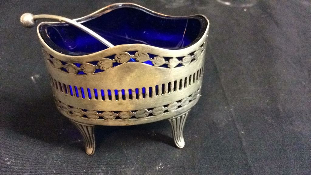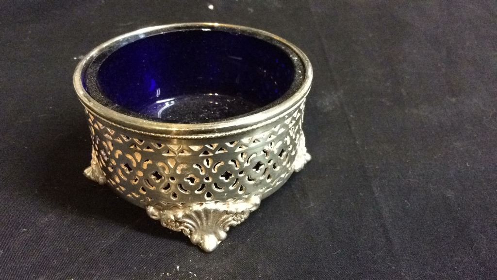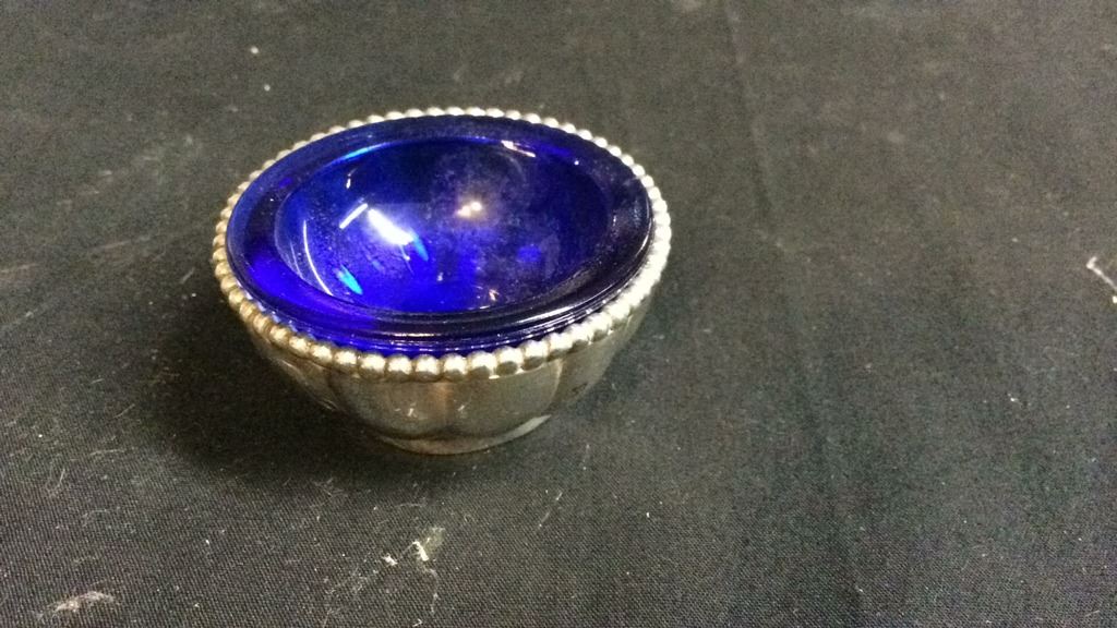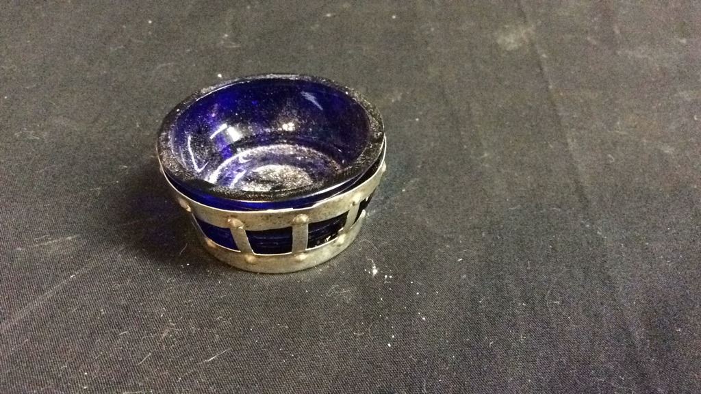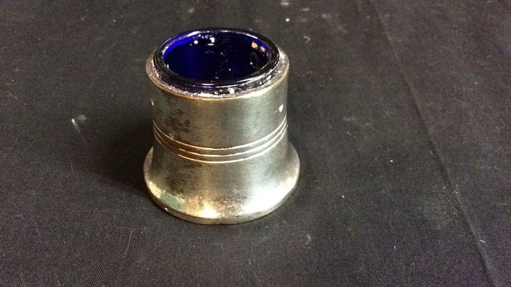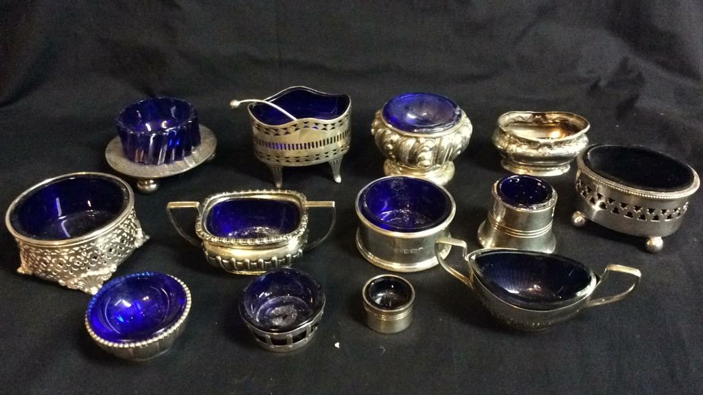 Collection of 13 Unique Salt Dips with Cobalt Blue Inserts. Many have proof marks and marked sterling