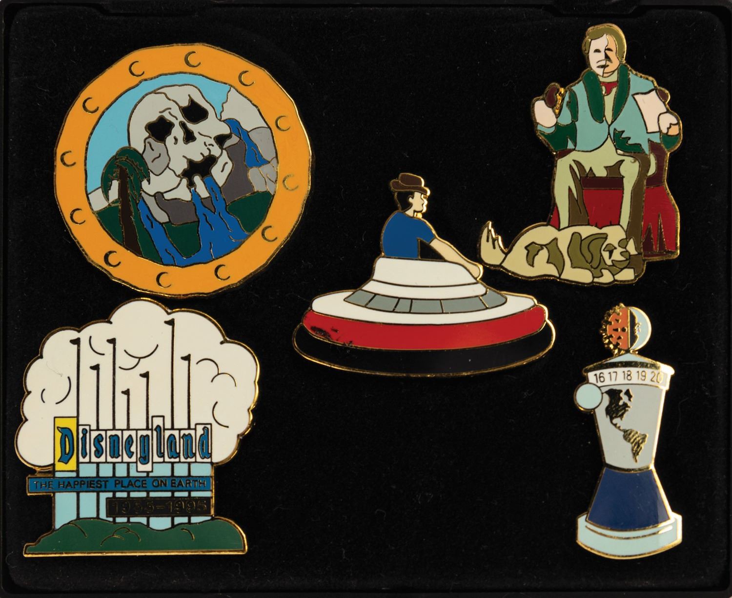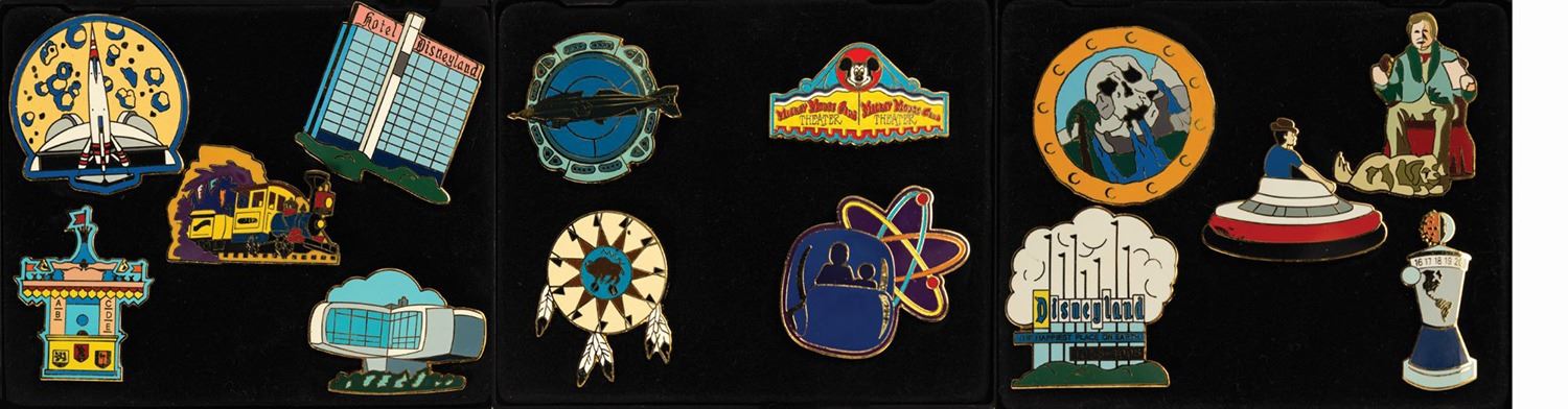 (Disneyland, 1995) A collection of (14) pins offered exclusively to cast members for the 40th anniversary of Disneyland. These pins were sold in (3) sets and celebrate attractions which were no longer at the park. Each set contains description cards with information about the retired attractions. The pins are approximately 1.5"x1.5" with some variation and come in a 3.5"x4.25" case with 4-5 pins each. The condition is very good with minimal wear.