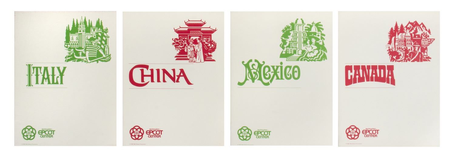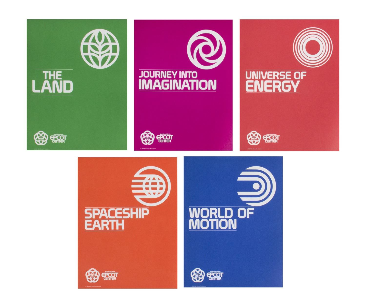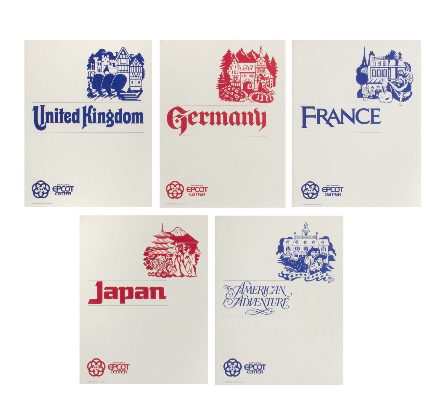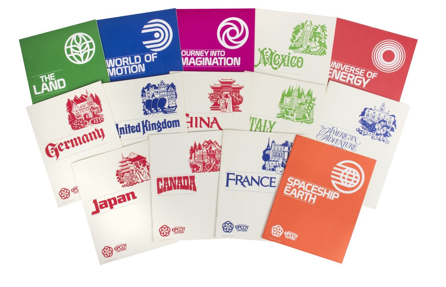 (EPCOT, 1982) A collection of (14) guidebooks created for the Opening Year of EPCOT Center. These guides feature the various attractions and Pavilions found at EPCOT Center including "The American Adventure", "Spaceship Earth", "Universe of Energy", The Land Pavilion, "World of Motion", "Journey into Imagination", France Pavilion, Canada Pavilion, Japan Pavilion, Germany Pavilion, Mexico Pavilion, United Kingdom Pavilion, China Pavilion, and the Italy Pavilion. These guides offer great photos and information on the attractions and lands and as a set, provide an indepth look at EPCOT Center during its opening year. Each guide measures 11"x8.5" and the set is in overall good condition with minor wear from use.