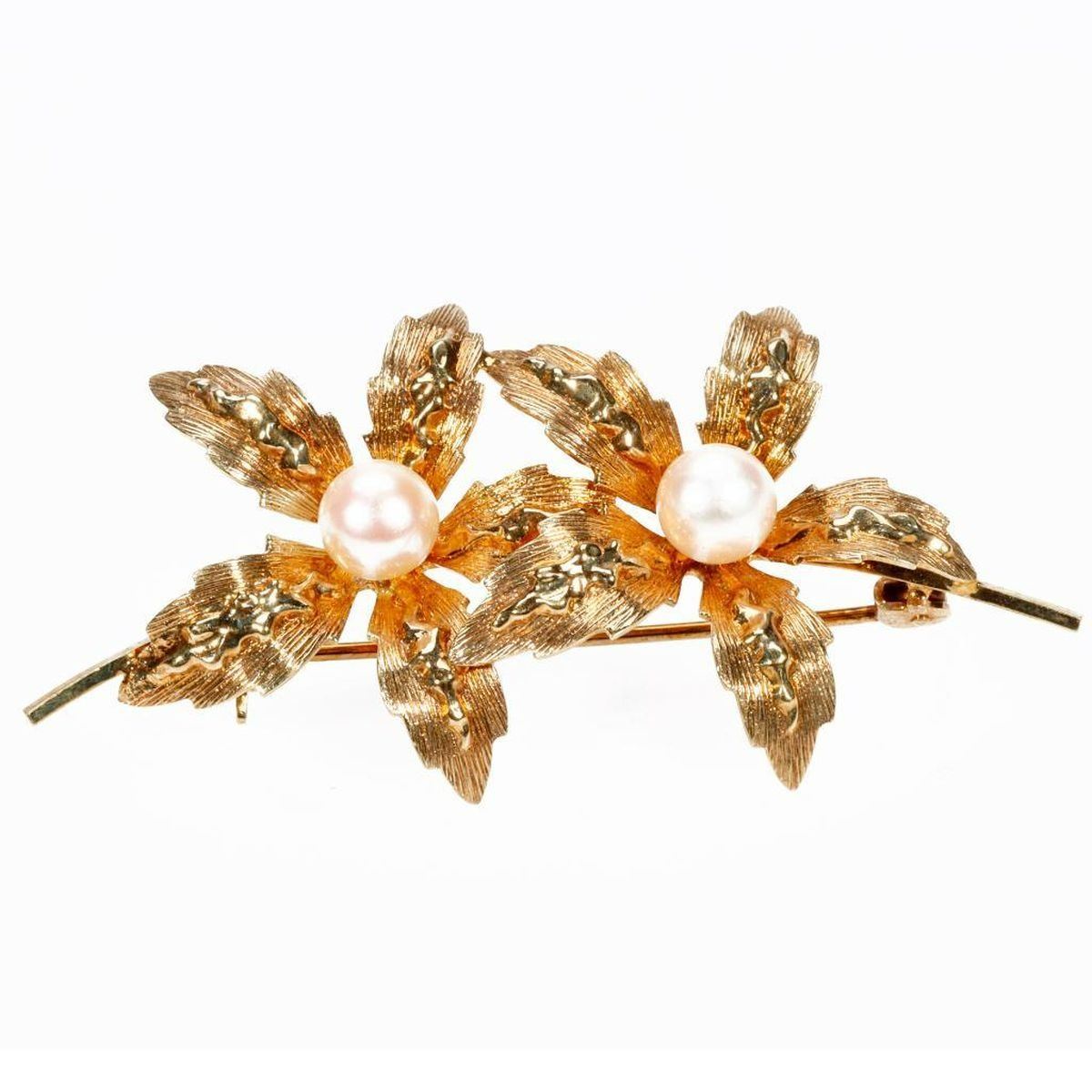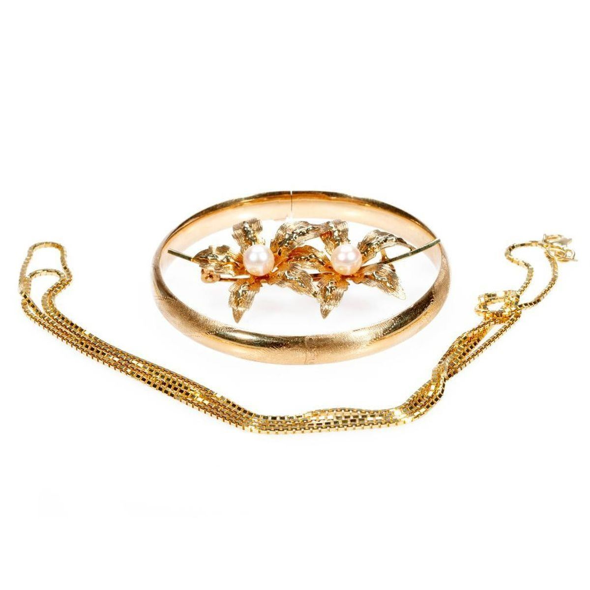 comprising a hinged bangle bracelet, a box link chain, and a cultured pearl floral brooch; gross weight approximately 22.4 grams; bracelet size 6 3/4in., chain length 29in.