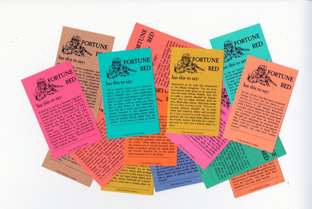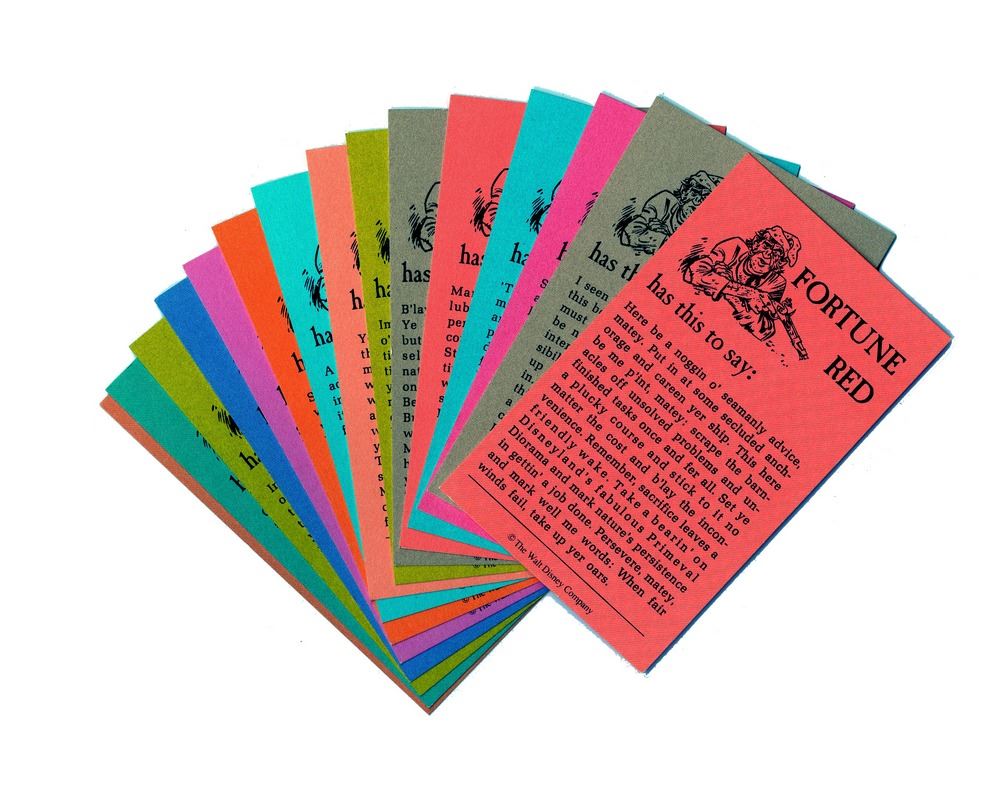 (Disneyland, 1960s) Colorful collection of (15) fortune cards from the "Fortune Red" fortune-telling machine machine in the Pieces of Eight shop in New Orleans Square. One card is a duplicate, the rest are unique. Cards measure 4.15"x2.5", each. Set is in good condition.