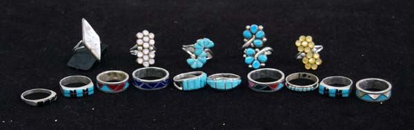 Collection of 15 Native American Sterling Rings, Mixed Stones, includes: Mother of Pearl Flower Design size 3.75, Petit Point Turquoise Band size 8, Turquoise Jet Channel Inlay size 7.75, Turquoise Jet Inlay size 6.5, Turquoise Channel Inlay Band size 6.25, Turquoise Gold Mother of Pearl Wedding Band size 7.25, Lapis Inlay Wedding Band size 9.25, Sugilite, Coral, Mother of Pearl, Angel Coral, Malachite, Turquoise Wedding Band size 9, Gold Lip Shell Petit Point Flower Design by Dishta size 6.5, Pink Mother of Pearl Channel Inlay size 6, Coral Turquoise Inlay Wedding Band size 5.75, Turquoise Flower Design size 6.25, Jet Channel Inlay size 6, Turquoise Channel Inlay size 7.5, and Turquoise Flower Ring size 7.75, 45.7g in total wt.