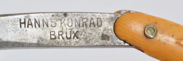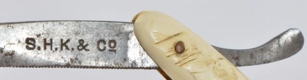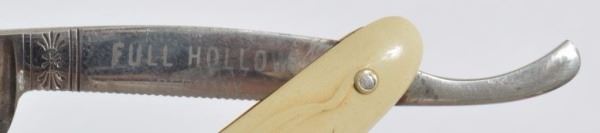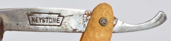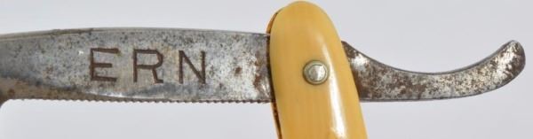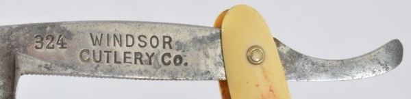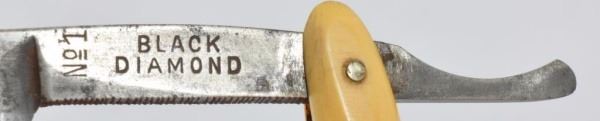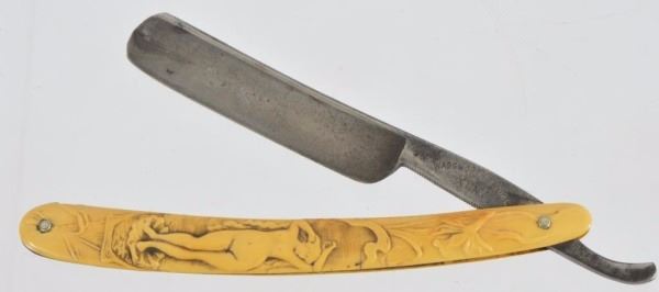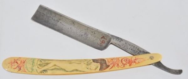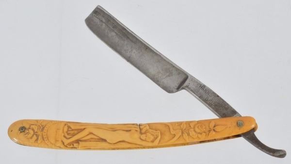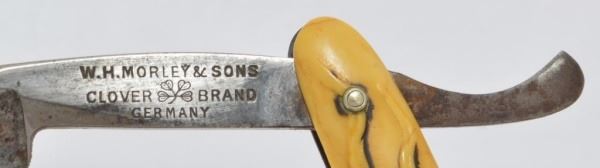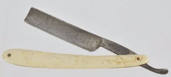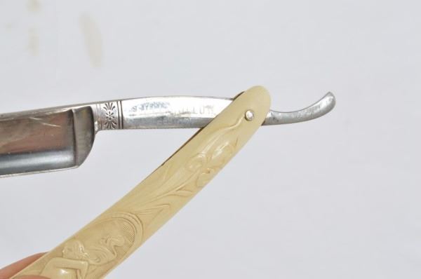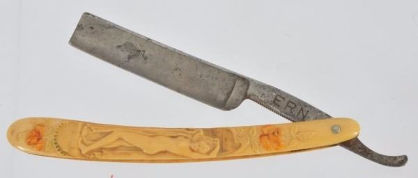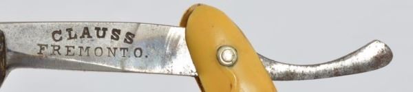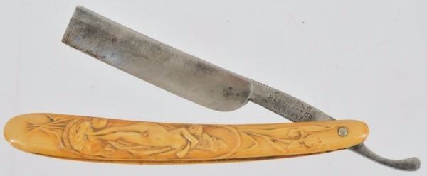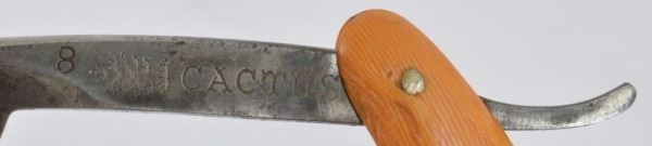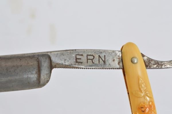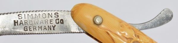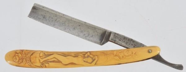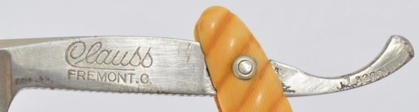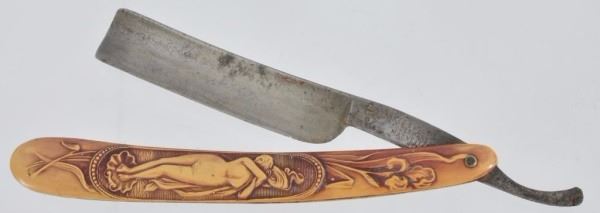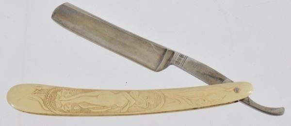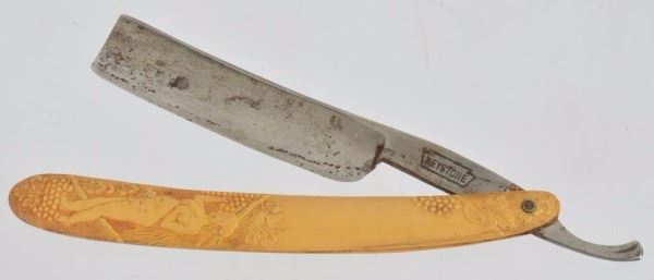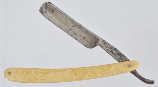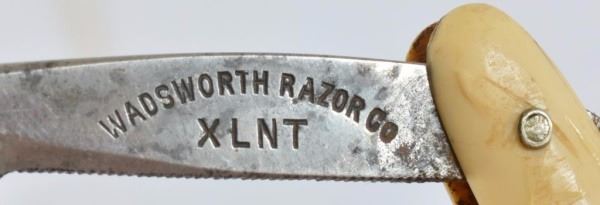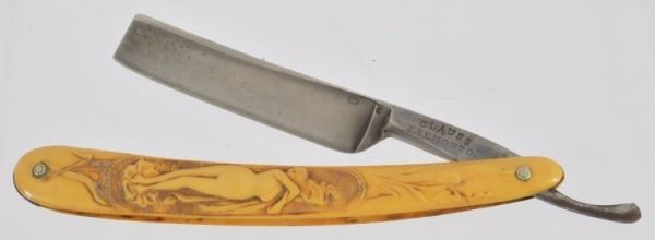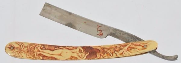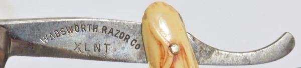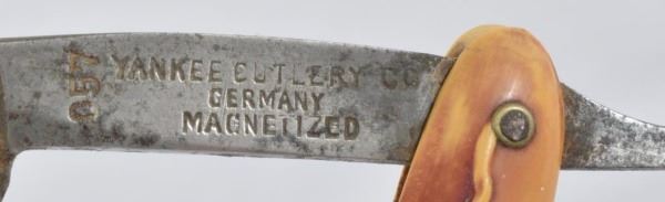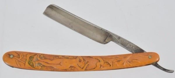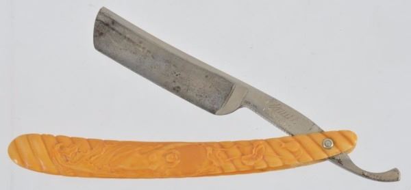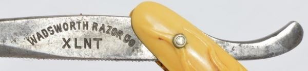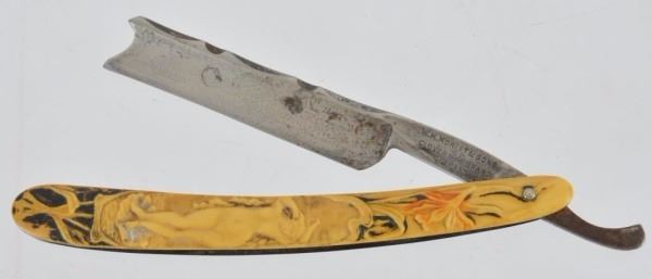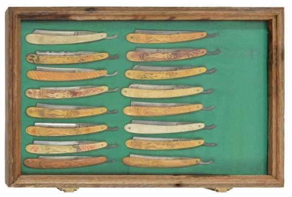 Celluloid antique razors in a wooden display case.