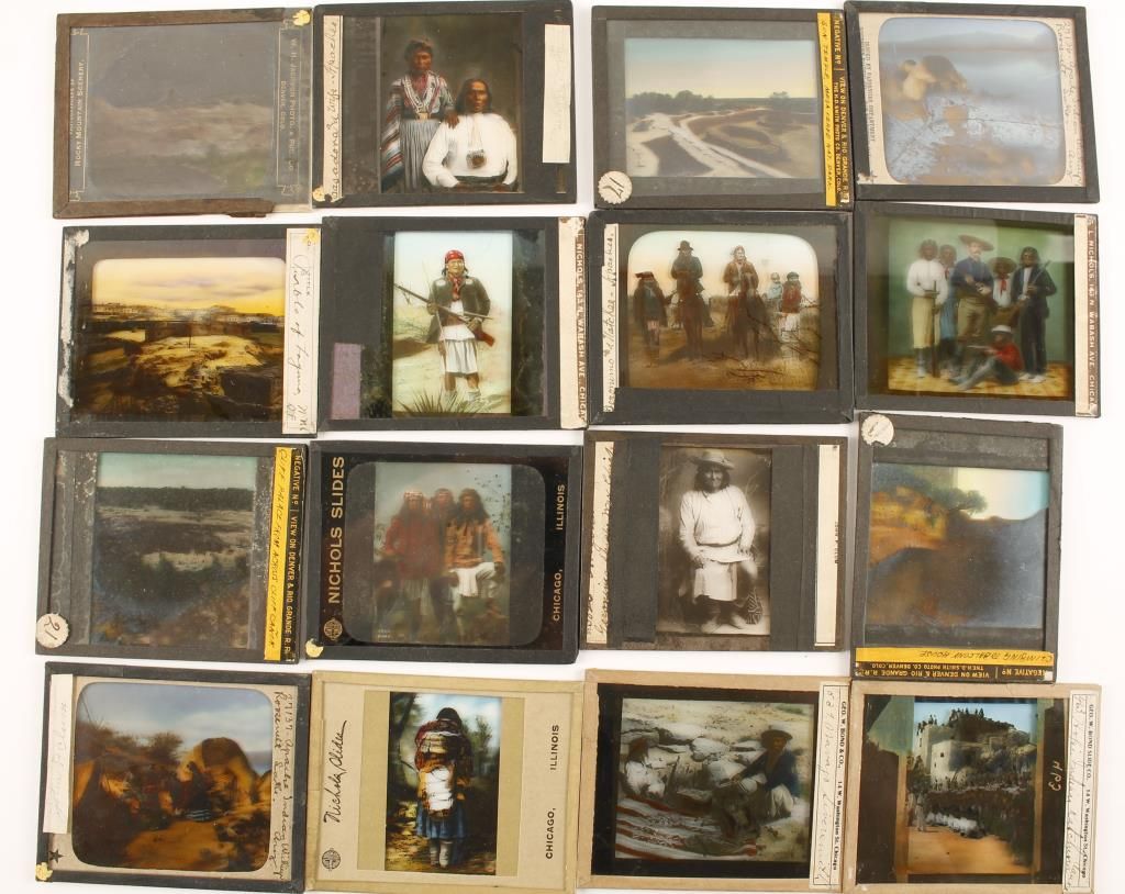 Including Geronimo, Cliff Palace, Apaches, Pueblo at Laguna NM, Hopi Kachina Dance, John P. Clum at Roosevelt Lake, Navajo silversmith and others. Hand labeled in pen with Thomas E Brents business card. United States Special Officer (Indian Service by Tradition who collected them. Some slides signed Nichols and hand colored, others not marked or identified. 16 total and card in two Riker displays). One slide has a crack in it.